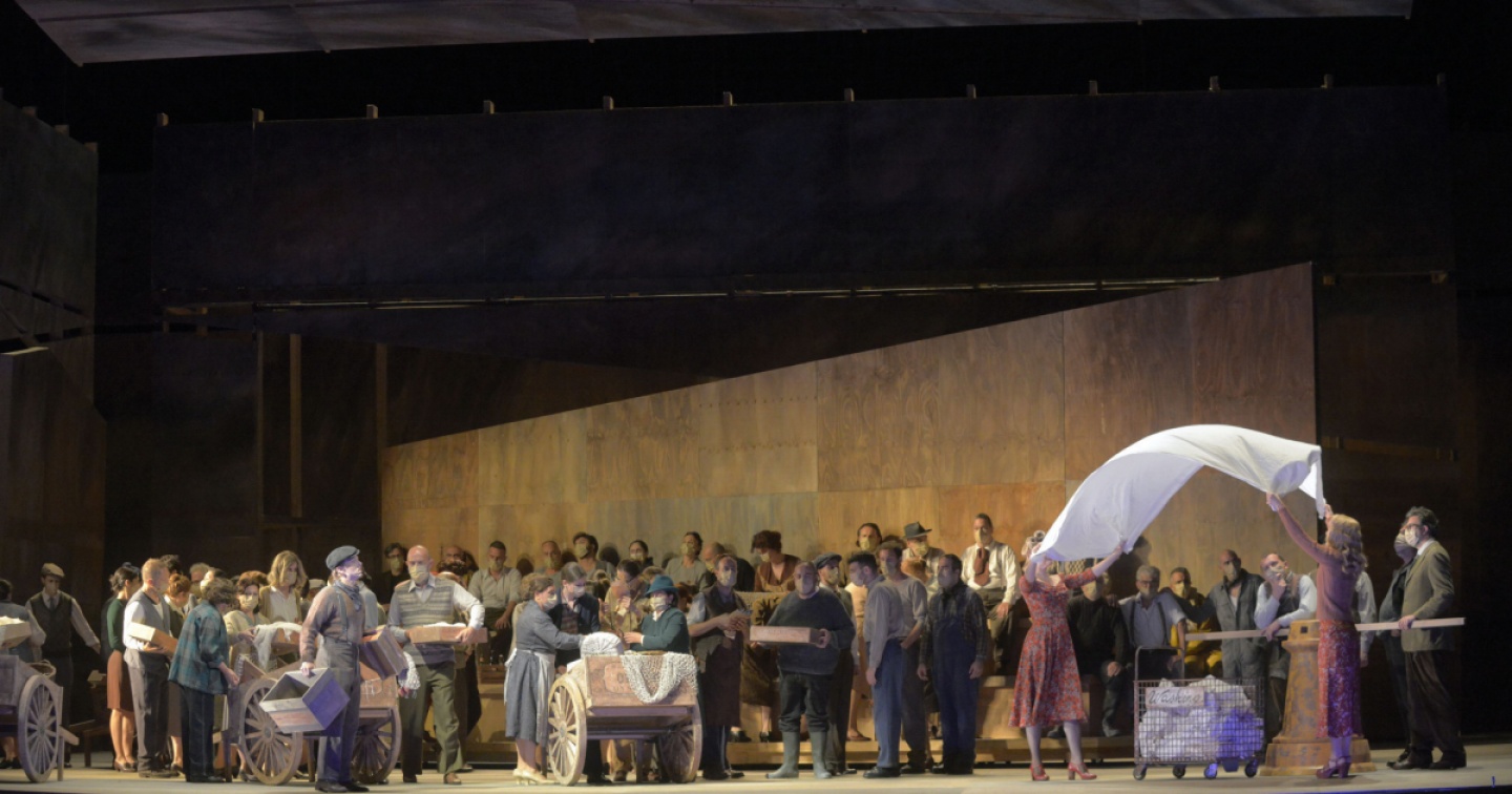 Il ‘Peter Grimes’ protagonista dell’opera è un uomo che per le sue azioni viene posto al di fuori della comunità, condannato non dalla legge, ma dalla volontà popolare, che si trova solo in una solitudine che ha come obbligata uscita il suicidio. Grimes (convincente, seppur più attore che cantante, il tenore Andrew Staples) è un pescatore del Borgo, un villaggio costiero del Suffolk, e Britten ce lo presenta, in un intenso prologo davanti a un tribunale dove deve rispondere della morte di un mozzo durante una pesca finita male per colpa di un uragano. È assolto dal giudice ma non dagli abitanti del villaggio che lo accusano di essere violento e brutale nei confronti dei ragazzi che assume. Con lui restano Ellen (l’interessante soprano Emma Bell), una giovane maestra vedova, che lo ama riamata, e Balstrode (un convincente Mark S. Doss), un vecchio comandante di marina che comprende la fatica di un uomo che cerca di avere un futuro lavorando duramente.