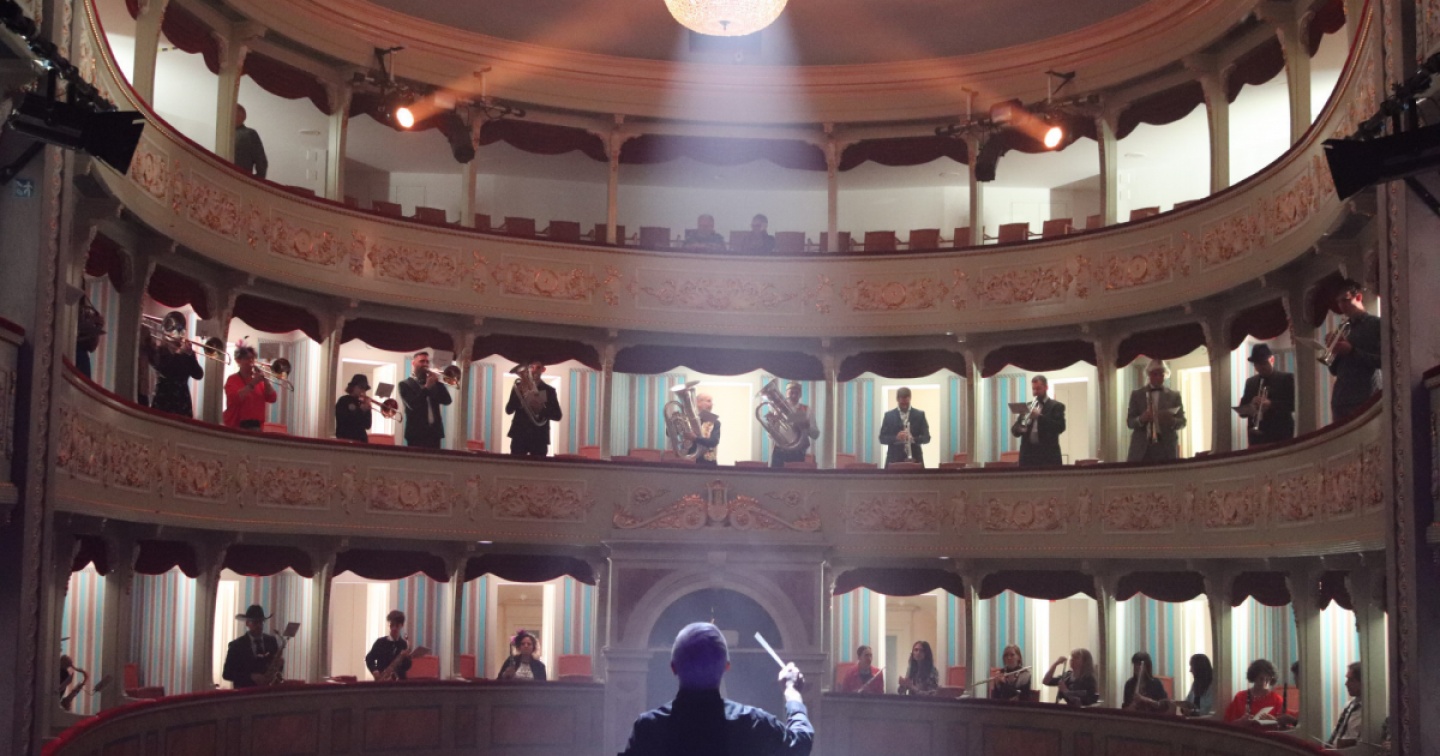 Teatro SocialeIn provaIn ‘Fanfara Favolosa’, Hominal cura regia e coreografia. Al suo fianco, Rocco Schira. Senza entrare troppo nei dettagli, il palco – inizialmente ‘allo stato brado’ – è allestito in diretta dai musicisti, alcuni di essi simpaticamente felliniani nel doversi presentare al pubblico, e felliniani in pieno in quel che vien chiesto loro di fare sin dall’inizio. Il resto lo fanno il Sociale, la musica e l’onirico di cui sopra. Ed è vero quanto dice Hominal sul fatto che “immaginare questo progetto in un magnifico teatro all’italiana ha la grandiosità di un intero corpo di ballo”, perché la filarmonica a modo suo danza, sulle note che hanno “nutrito la mia infanzia”, l’infanzia di Hominal ma anche l’infanzia di tutti, o almeno di molti. Di tutto l’onirico annunciato, spicca un momento/citazione di ‘elevazione’ strumentistica reso particolarmente suggestivo dal disegno luminoso di Marzio Picchetti.