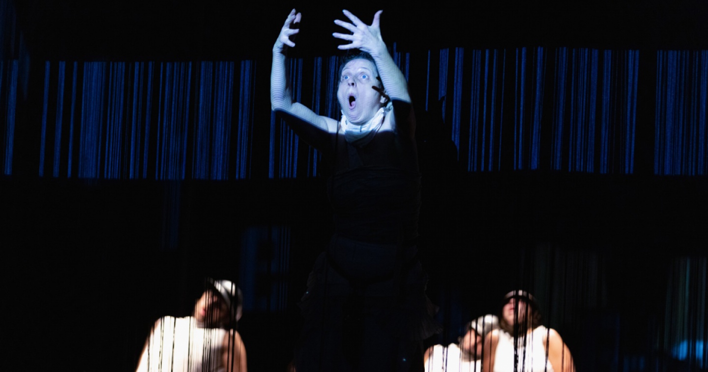 A questo lungo elenco si è unito Marco Maria Linzi con il suo ‘Miss Bartleby. Non è tempo di essere’, in scena martedì e ieri al Lac che ha coprodotto lo spettacolo insieme a Teatro della Contraddizione e MTM Teatro. Linzi ha messo insieme il teatro dell’assurdo – del quale il racconto di Melville è considerato un precursore – e una riflessione sulla natura umana. Dove quel “messo insieme” significa che Linzi ha diviso il lungo spettacolo in due parti, separate da un intervallo, che sono parse due opere diverse (almeno agli spettatori che sono rimasti in sala fino alla fine, e alla rappresentazione di martedì non erano molti). Il primo atto, definito “dispositivo simbolico di apprendistato”, è una frenetica coreografia con miss Bartleby su un piedistallo al centro della scena e otto attori e attrici muoversi in una sequenza di quadri ipnotica e disorientante. Una voce fuori campo e alcune scritte proiettate su due tende leggere sono le uniche parole comprensibili, per il resto abbiamo un grammelot che in breve spinge il pubblico (o meglio “il comitato”, come viene definito dalla voce fuori campo) a rinunciare a capire e a lasciarsi trascinare dal ritmo e dal flusso di eventi, una volta superato il turbamento iniziale dovuto anche agli aspri suoni di scena.