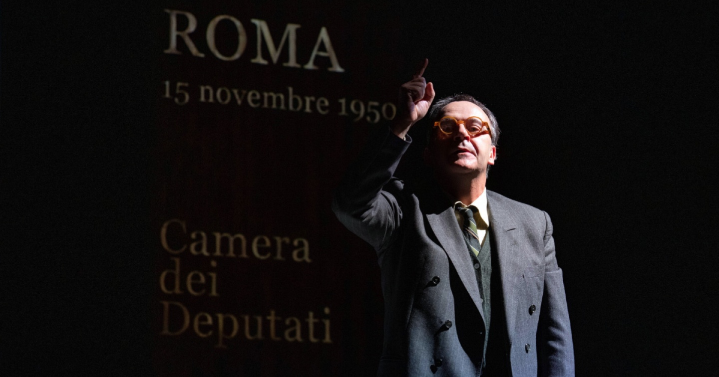 Portare in scena questa prole è stato certamente molto impegnativo ma devo dire che c’è stato l’intervento di un bravissimo regista, Carmelo Rifici, che ha guidato tutta questa operazione, lavorando con gli attori e non solo perché ha seguito anche la scrittura. È stato un lavoro complesso, per la regia, per i collaboratori della regia e come detto per il gruppo di attori che si fa carico di questa responsabilità in modo molto eroico, con rigore e profondità. In particolare Paolo Pierobon, che è il protagonista, non imita semplicemente De Gasperi ma entra in questo percorso interiore.