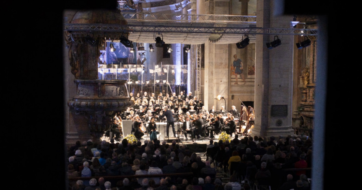 Due solisti di classe, la soprano Anna Prohasca e il baritono Josef Wagner. La piccola grande Orchestra della Svizzera italiana con ventisette archi, un organico su misura per l’opera in programma. Il Coro della Radiotelevisione svizzera con oltre quaranta coristi ben collocati all’ingresso dell’abside. Sono componenti contingenti di una splendida esecuzione, impreziosita dal contesto architettonico: l’ampio spazio costruito nel Cinquecento, le pitture e le sculture che l’hanno arricchito nei tre secoli successivi.