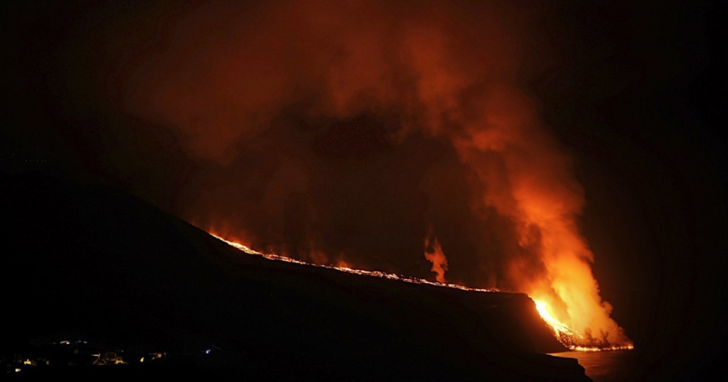 Una cascata di magma incandescente che finisce a capofitto nel mare da una scogliera: è l’immagine "impressionante" osservata per la prima volta nella tarda serata di martedì a La Palma, isola delle Canarie colpita da oltre dieci giorni dall’eruzione del vulcano Cumbre Vieja. Un flusso di lava che ha creato un “delta” di materiale vulcanico fumante nell’oceano, alimentato da una colata attiva anche nelle ore successive.