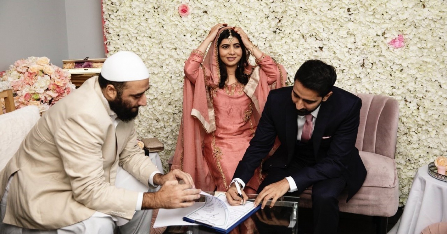 Abito color pesca, lunghi orecchini e il bindi, tradizionale gioiello che pende sulla fronte, occhi bistrati. Malala, nel giorno del suo matrimonio è raggiante, e posta su Twitter le foto della cerimonia che oggi a Birmingham l’ha unita ad Asser Malik, imprenditore e General Manager del Pakistan Cricket Board. Il premio Nobel per la Pace, che oggi ha 24 anni, ha deciso di dare l’annuncio sui social e di condividere con i suoi follower la felicità di un nuovo inizio che ha descritto come un “giorno prezioso” nella sua vita.