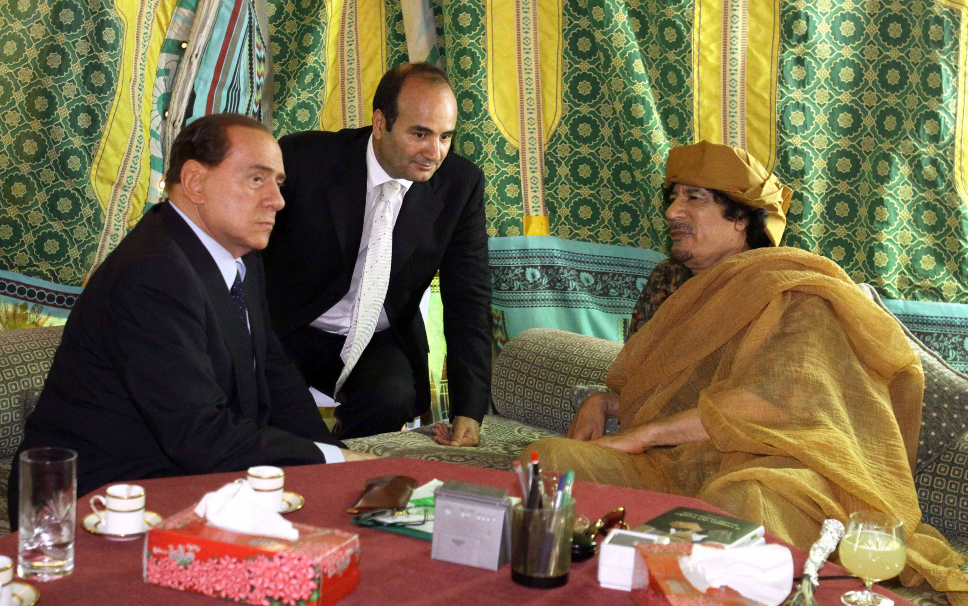 Berlusconi, negli anni, si è accompagnato, e con una certa soddisfazione, a figuri come Gheddafi (a cui permise di installare una tenda beduina a Villa Pamphilj, a Roma) e Putin, ha cercato di rivalutare goffamente Mussolini (“ha fatto anche cose buone” e dintorni) per compiacere gli alleati di destra e ha sempre flirtato con aree grigie e anime nere: i rapporti mai del tutto chiariti con la mafia ai tempi della sua ascesa come imprenditore edile, la presenza ad Arcore del suo “stalliere” Vittorio Mangano (un pluriomicida affiliato a Cosa Nostra), il legame stretto con Marcello Dell’Utri, poi condannato a sette anni per aver fatto da tramite proprio fra Berlusconi e le cosche, la tessera numero 1816 della loggia massonica P2, la famosa foto in bianco e nero in stile “Padrino”, in piena ascesa televisiva, con completo, capelli leccati e pistola in bella vista sul tavolo.