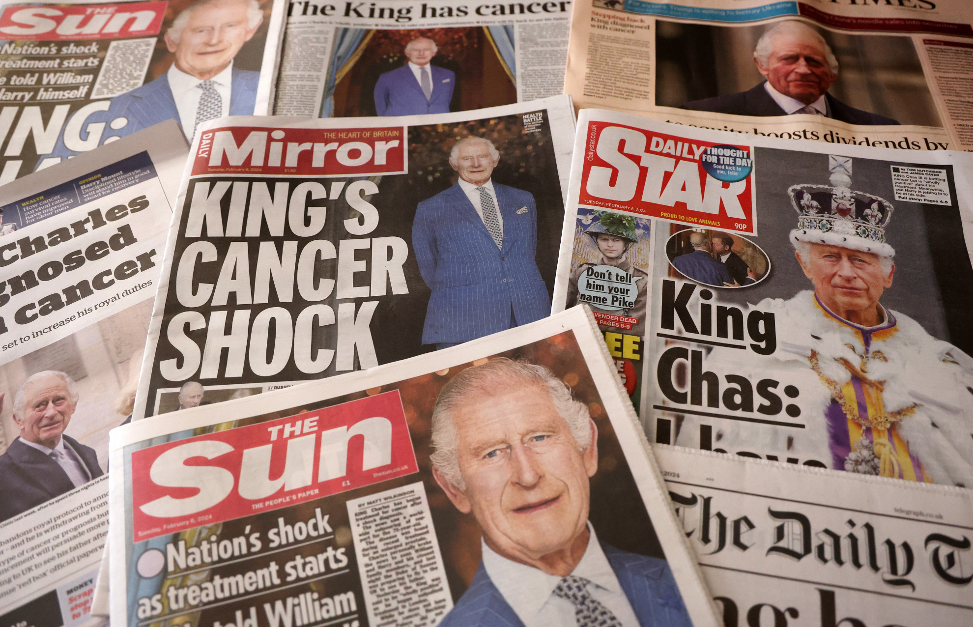 KeystoneI giornali britannici con la notizia"Fortunatamente la diagnosi è stata precoce", ha certificato intanto alla Bbc il premier Sunak, rinnovando - all'unisono con i leader di mezzo mondo - l'augurio che "Sua Maestà si possa ristabilire completamente". E garantendo d'essere "in contatto regolare" col re, per quanto a distanza, a conferma del fatto che le cure non gli impediranno di continuare a esercitare le prerogative costituzionali di capo di Stato, senza supplenze o co-reggenze formali, al di là del forfait dagli impegni esterni per svolgere parte dei quali torna da domani all'attività pubblica anche il principe William.