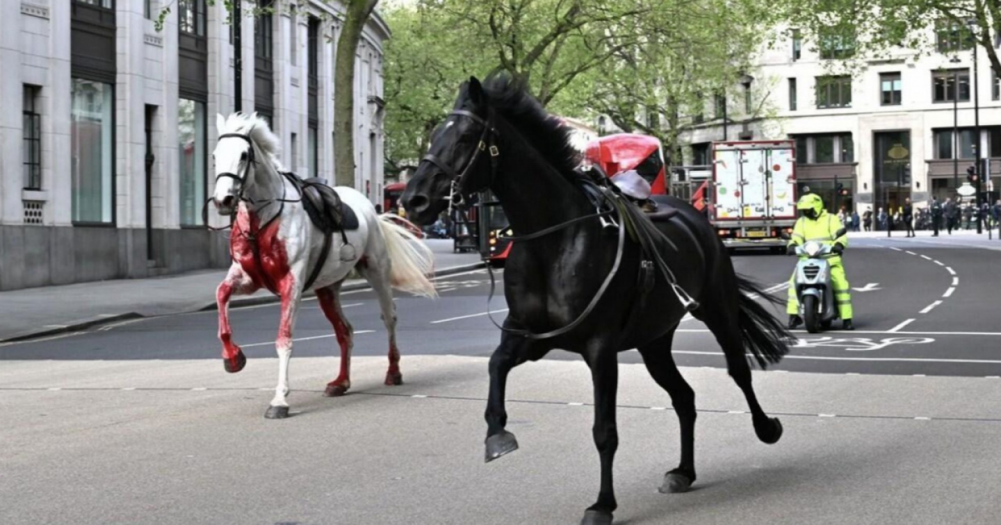 Due cavalli – uno bianco e uno nero – sono stati visti galoppare liberi, e alquanto spaventati, per le strade trafficate di Londra nella mattinata di mercoledì, gettando così il centro città nel caos per un paio d'ore. Gli esemplari appartengono alla Cavalleria domestica dell'esercito britannico e, stando alle prime informazioni diffuse dai media inglesi, gli animali sarebbero scappati, insieme ad altri tre equini, da una scuderia di Londra durante una sessione di allenamento. Durante la loro fuga, sarebbero rimaste ferite quattro persone, fra queste anche un cavaliere disarcionato.