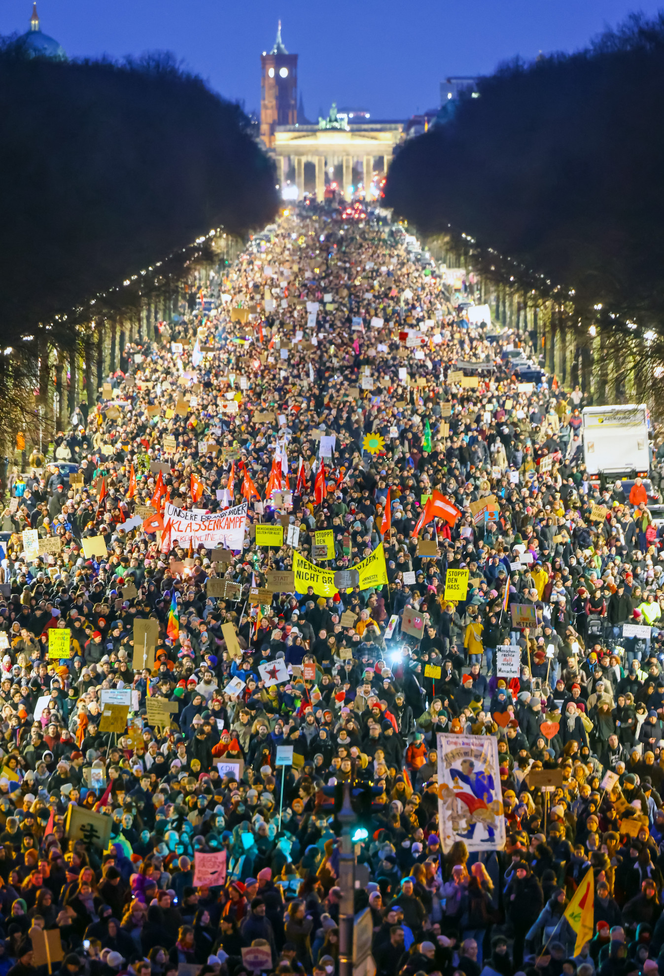 "Il Brandmauer siamo noi!". A Berlino una marea umana parte dal Bundestag per raggiungere la Adenauer Haus e sfidare Friedrich Merz, il leader della Cdu che ha messo a rischio la tenuta del muro politico che isola l'ultradestra di Afd in Germania, in questa tumultuosa settimana, che potrebbe aver segnato irreparabilmente la corsa dell'eterno avversario di Angela Merkel al voto di febbraio. "Ciao a tutti siamo 250 mila!", ha gridato dal palco una delle organizzatrici della protesta, illuminata prima da un incredibile tramonto, poi da migliaia di fiaccole. Per la polizia sono 160 mila.
