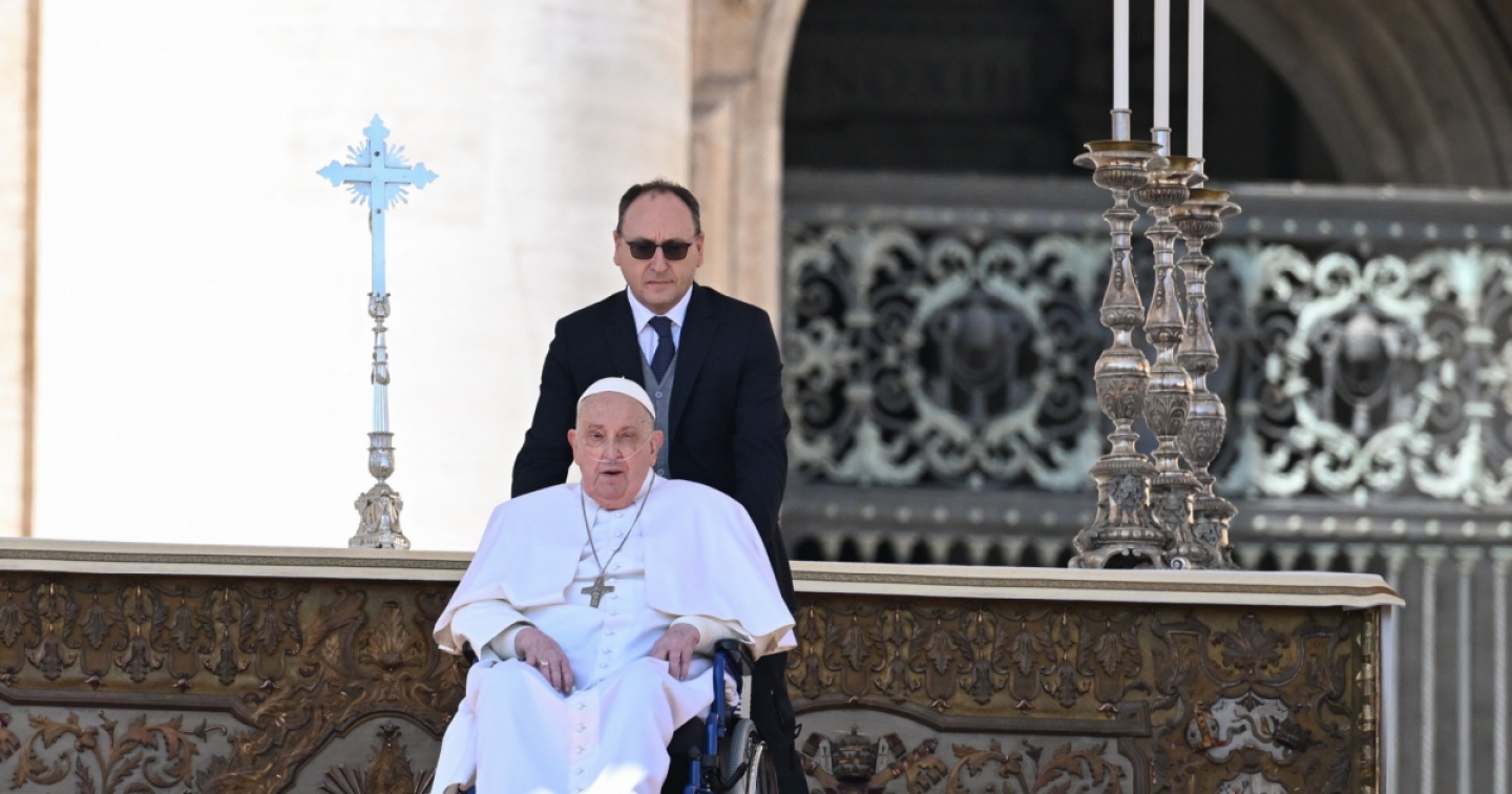 Bergoglio con l’ossigeno arriva in carrozzella sul sagrato della basilica vaticana al termine della messa per il Giubileo degli ammalati
