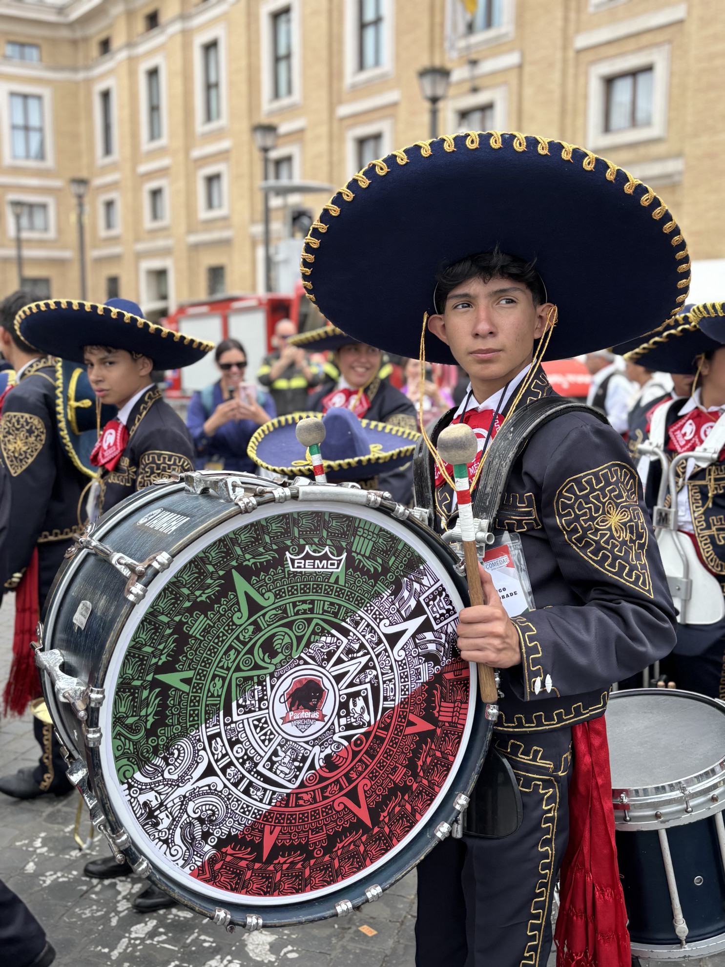R. ScarcellaUn ragazzo di una banda messicanaA rendere il tutto ulteriormente festaiolo e meno rigido ha contribuito poi la presenza (già prevista nel calendario del Giubileo) di varie bande da tutto il mondo, schierate nelle prime file, in abiti tradizionali, che si sono sbizzarrite, prima e dopo il Regina Coeli, intonando pezzi tutt’altro che religiosi come “Cielito Lindo”, “Rosamunda” e “Seven Nations Army”.