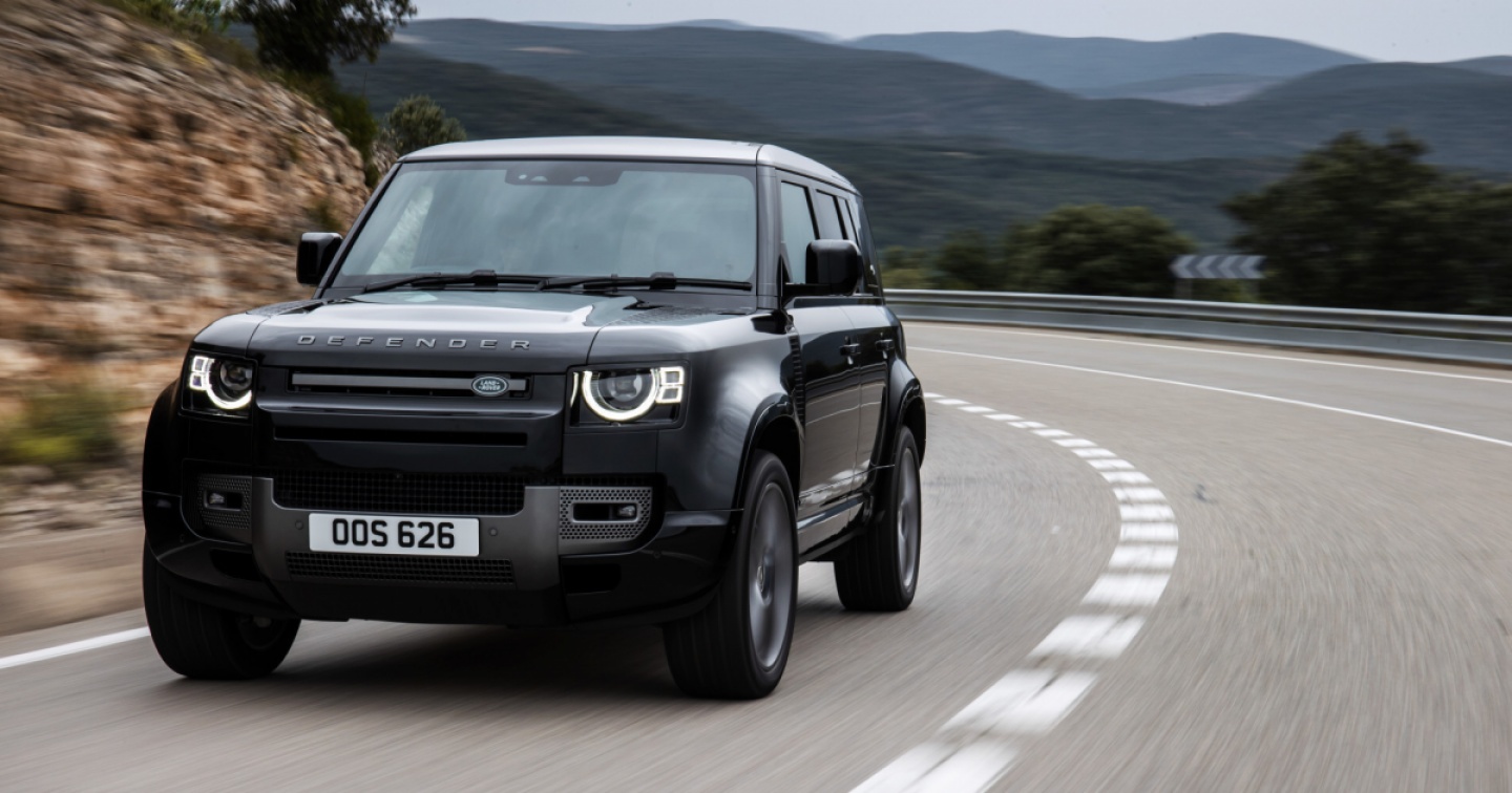Ci è arrivata col vestito “total black”, inclusi cerchi lucidi da 22”e vetri oscurati, in una combinazione che sottolinea una presenza autoritaria, vagamente aggressiva ma pure discreta nell’annunciare l’esotica motoriz-zazione che rende questa versione speciale: solo due targhette quasi invisibili e, in coda ben quattro terminali di scarico. Perché la Defender oggetto della prova monta il son-tuoso otto cilindri a V di 5.0 litri con com-pressore volumetrico capace di trasformare questo autentico 4x4 - sia pur così evoluto tecnicamente - in uno strumento dinamico di gran pregio. Anzi, sorprendente: capace di tener testa ad una Classe G AMG, sfode-rando un piacere di guida aggressivo dal-l’intensità e dal carattere rari; che forse mai avremmo pensato di ritrovare in una Land Rover, e tantomento in una Defender. Ver-sione certamente destinata ad un pubblico elitario questa V8, anche per prezzo e con-sumi, ma che su strada ha mostrato di me-ritare sincera ammirazione, perché è dav-vero raro trovare veicoli capaci di queste qualità al volante, ancor meno pensando all’architettura da fuoristrada “puro”. La Defender di punta è curiosamente ancora più sportiva - è vero, richiedendo mano un po’ smaliziata - di tante concorrenti che mil-lantano velleità sportive e sembra al tempo stesso meno pesante di tante ibride plug-in, in realtà più leggere anche di 400 kg; men-tre qui sono in gioco ben 2,6 tonnellate a secco senza passeggeri.