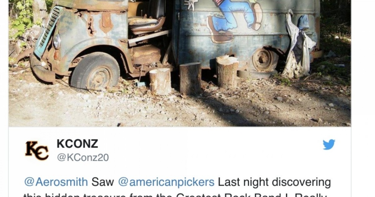 Quel che resta del furgone degli Aerosmith, con tanto di logo della band dipinto sulla fiancata, era abbandonato nei boschi di una piccola città del Massachusetts. Lo hanno ritrovato Mike Wolfe e Frank Fritz, i due protagonisti dello show di History Channel 'American Pickers', da noi noto con il titolo 'Gli Svuotacantine'. I due hanno rinvenuto il rottame a Chesterfield, una città di circa 1.200 abitanti, 100 miglia a ovest di Boston. Nessun dubbio sull'autenticità del reperto archeo-rock: ad autenticarlo è accorso Ray Tabano, che su quel furgone ha viaggiato nei primi giorni degli Aerosmith, prima di uscire dalla band nel 1971. Salito a bordo, Tabano non ha esitato un momento: il furgone è proprio lui, quello che ai tempi gli Aerosmith chiamano affettuosamente 'rolling hotel', l'albergo viaggiante.