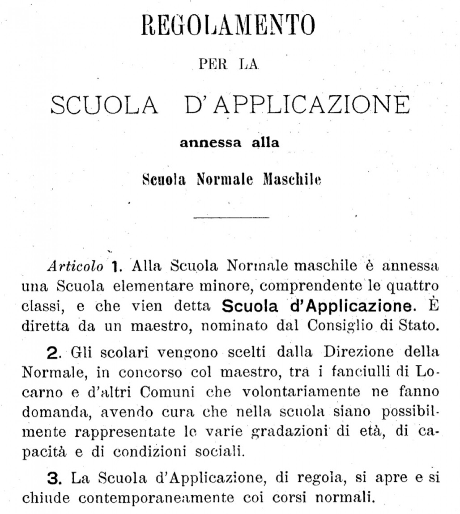 supsi - dfaRegolamento scuola pratica 1899Nel resto della Svizzera si era intanto imposto un altro modello di formazione, quello seminariale, chiamato così per analogia con i seminari dei sacerdoti: si entrava in queste scuole subito dopo la scuola dell’obbligo, si stava in convitto, si studiava per diversi anni e si usciva, giovane adulto, con una patente di maestro o maestra. Nelle scuole magistrali la formazione era più teorica, più incentrata sulla cultura e sulle conoscenze, il ruolo della pratica professionale era piuttosto limitato. Erano, e sono rimaste fin verso la fine del secolo scorso, scuole di cultura più che luoghi di formazione professionale. In Ticino, una scuola magistrale di questo tipo aprì le porte nel 1873, a Pollegio, da dove pochi anni più tardi venne trasferita nella città di Locarno che ancora oggi ospita la formazione degli insegnanti nel nostro cantone.