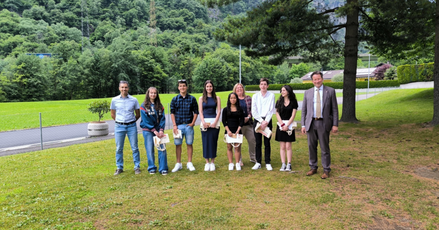 Venerdì 14 giugno la Banca Raiffeisen Tre Valli ha premiato le migliori licenze della Scuola media di Giornico-Faido. Nella foto, da sinistra, Danilo Stefanoni (vicedirettore), Alyssa Domenighini, Samuele Pellegrini, Bojana Novakovic, Julia Bastone, Katia Realini Luzzi (Banca Raiffeisen Tre Valli), Damiano Pasci, Ludovica Spina e Fabrizio Viscontini (direttore).