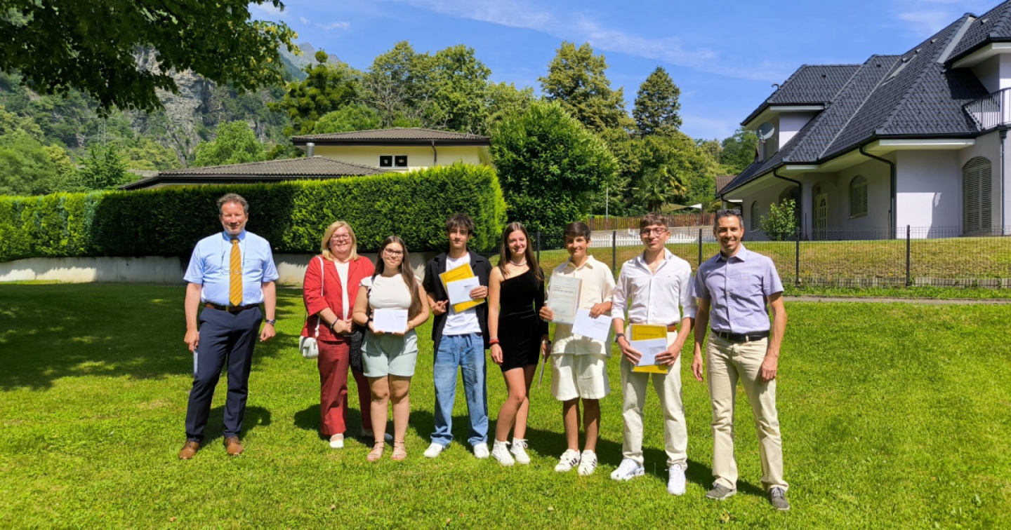 Mercoledì scorso la banca Raiffeisen Tre Valli ha premiato le migliori licenze della scuola media di Giornico-Faido, ottenute da Melany Oliveira (due corsi B), Bryan Tuscano (un corso A e uno B), Elena Carlucci (due corsi A), Aron Mandioni (due corsi A), Andria Ilic (due corsi A). Nella foto sono ritratti da sinistra con il direttore Fabrizio Viscontini, la rappresentante della banca Raiffeisen Katia Realini Luzzi e il vicedirettore Danilo Stefanoni.
