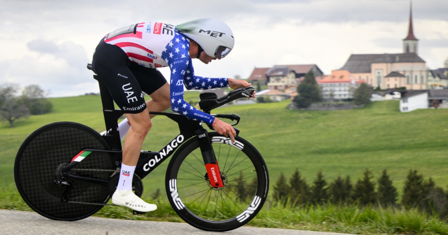Lo statunitense della Uae, più fortunato degli avversari, sfrutta l'asfalto asciutto; la maglia di leader del Romandie passa al suo compagno Ayuso