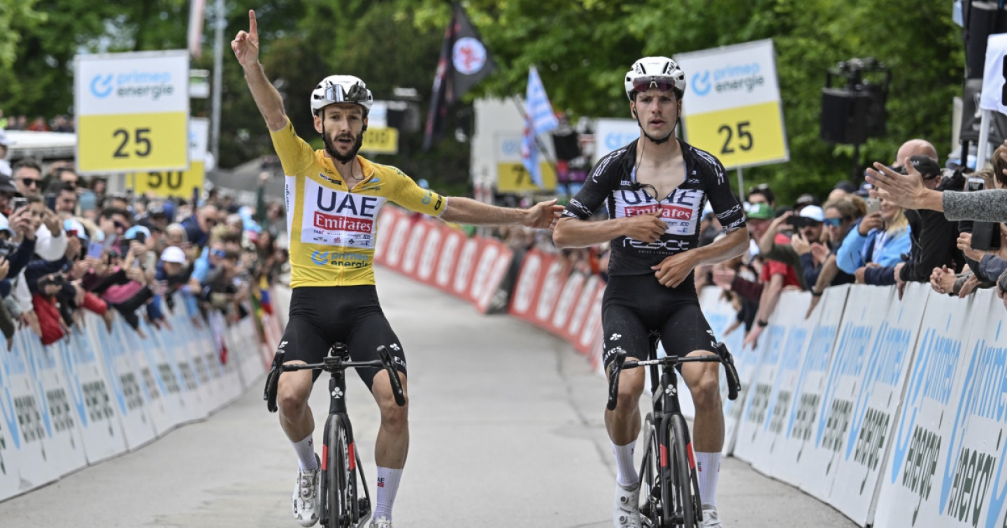 E tre. Ancora una volta. Adam Yates e João Almeida, per il terzo giorno consecutivo. A Villars sur Ollon, sotto lo striscione d'arrivo della settima (e penultima) tappa del Tour de Suisse 2024, sono loro a transitare per primi. Stavolta scelgono di farlo mano nella mano: niente volata ma arrivo a braccetto, a celebrare un'altra doppietta griffata Uae, per un giro che sorride sempre più al team di Mauro Gianetti.
