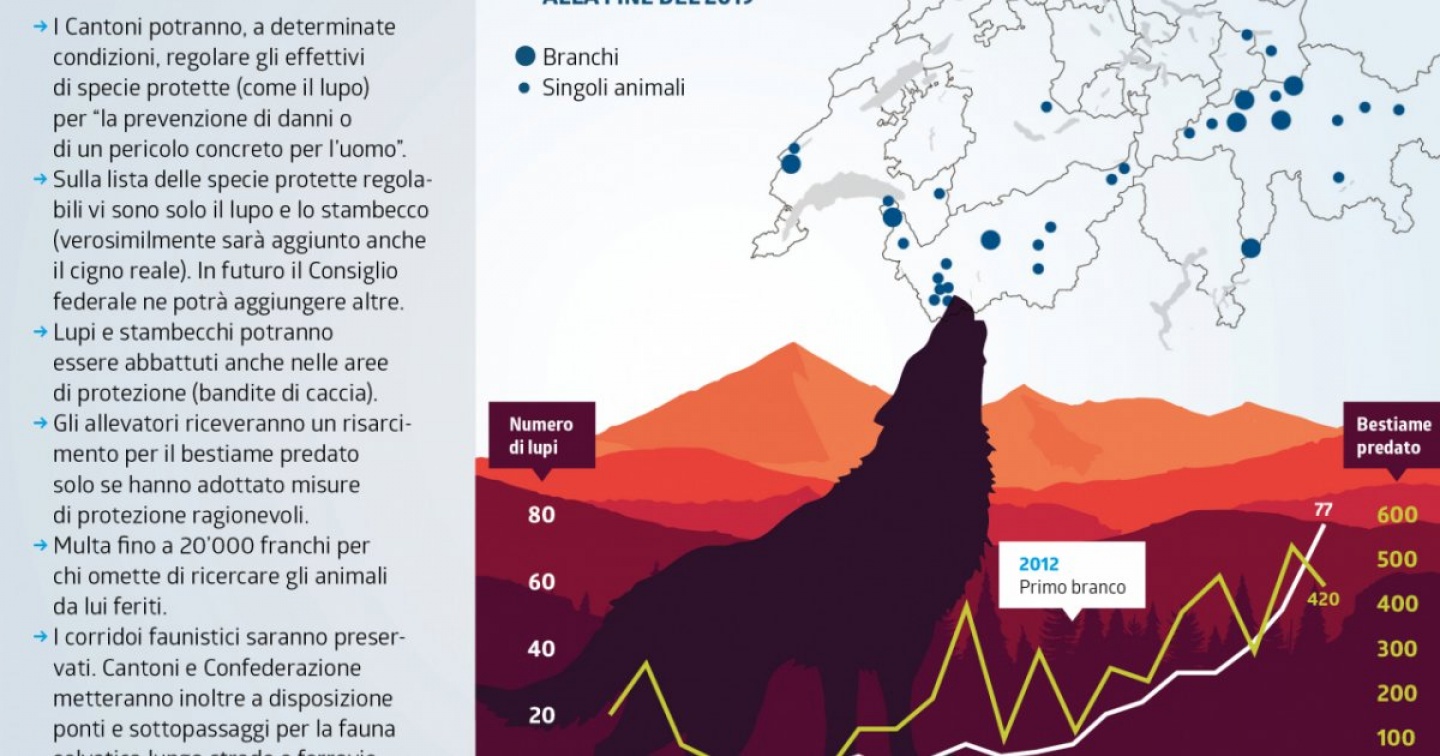 Il lupo rimarrà una specie protetta, ma le regole per il suo abbattimento saranno allentate. Saranno inoltre i Cantoni e non più la Confederazione ad avere l’ultima parola sulla regolazione degli effettivi: a differenza della legge attuale, dovranno solo “sentire” l’Ufficio federale dell’ambiente (indicando i motivi per i quali l’abbattimento è necessario), invece che ricevere il “consenso” per gli abbattimenti. A ciò va aggiunto che il lupo potrà essere abbattuto non più solamente se “causa danni ingenti o grave pericolo”, ma anche per “la prevenzione di danni o di un pericolo concreto per l’uomo”. Tuttavia, la nuova legge prevede che le “regolazioni non devono mettere in pericolo l’effettivo della popolazione” di lupi.