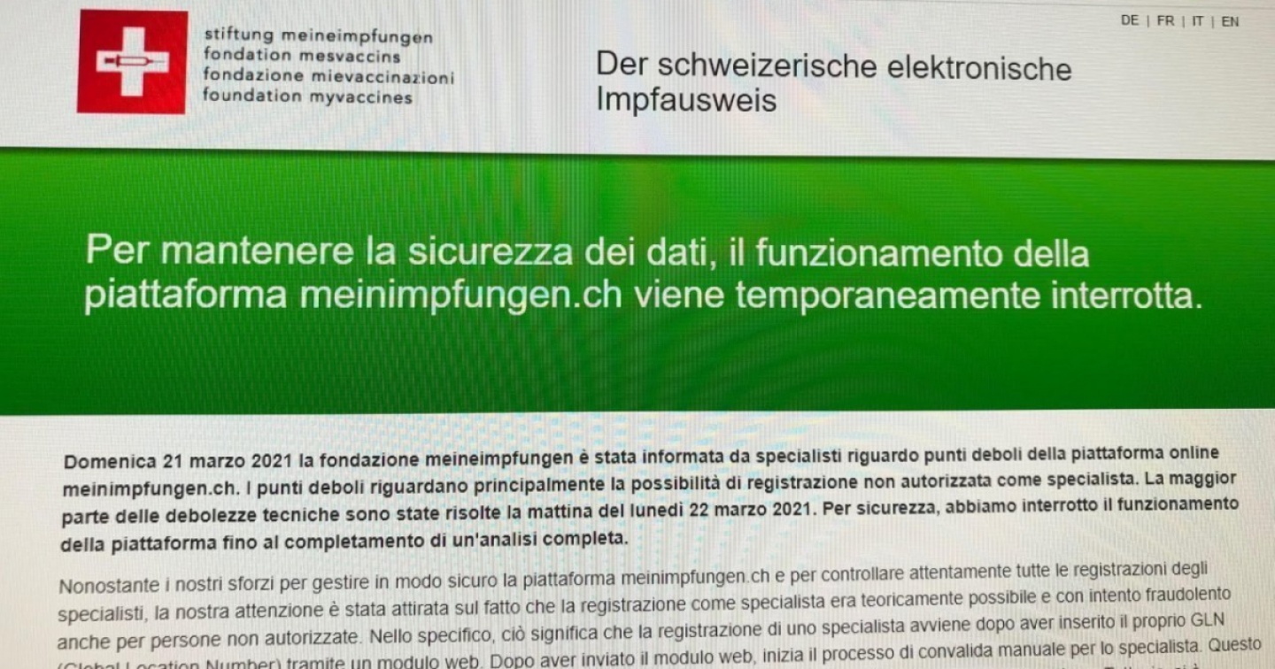 Contattato dall'agenzia Keystone-Ats, l'Ufficio federale della sanità pubblica (Ufsp) spiega di aver appreso da informazioni esterne che la piattaforma myCOVIDvac.ch potrebbe presentare gravi lacune in materia di sicurezza.