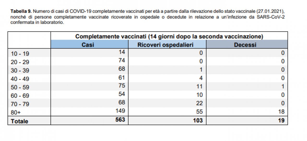 Dal 27 gennaio sono 19 le persone vaccinate decedute a causa del Covid, di cui 18 oltre gli 80 anni di età e uno fra i 60 e i 69 anni. Nello stesso periodo sono in totale 563 le persone che pur avendo ricevuto due dosi del vaccino hanno contratto il virus, di cui 221 (quasi il 40%) oltre i 70 anni di età: di esse 103 sono state ricoverate in ospedale, con 75 casi (quasi 3 su 4) riferiti a persone sopra i 60 anni.