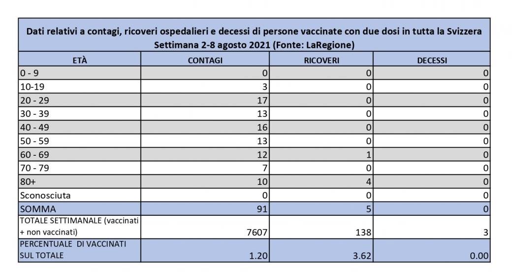 Dei 7'607 casi settimanali, solo 91 sono riferiti a persone vaccinate con due dosi, pari all'1,2% dei contagi totali: in 5 casi si è reso necessario il ricovero, mentre non si segnalano decessi di persone vaccinate. La fascia di età dei vaccinati numericamente più colpita è quella delle persone fra 20 e 29 anni, con 17 casi, seguita dalla fascia 40-40 con 16 casi: sono 3, inoltre, i contagi sotto i 20 anni, di cui nessuno sotto i 10 anni. Dei ricoverati, 4 su 5 appartengono alla fascia di persone con più di 80 anni, mentre in un caso è stata ricoverata una persona vaccinata di età fra i 60 e i 69 anni.