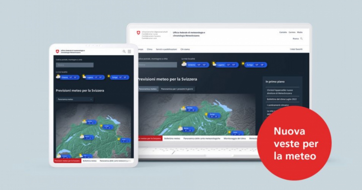 Nuova veste grafica per le previsioni del tempo di MeteoSvizzera. L’Ufficio federale di meteorologia e climatologia ha lanciato il 14 novembre il nuovo sito, adattando la propria presenza sul web agli ultimi sviluppi tecnologici. Un restyling che non riguarda solo la grafica, ma anche la gestione e la fornitura di un numero di dati sempre crescente, oltre che l’accelerazione dei tempi di caricamento.