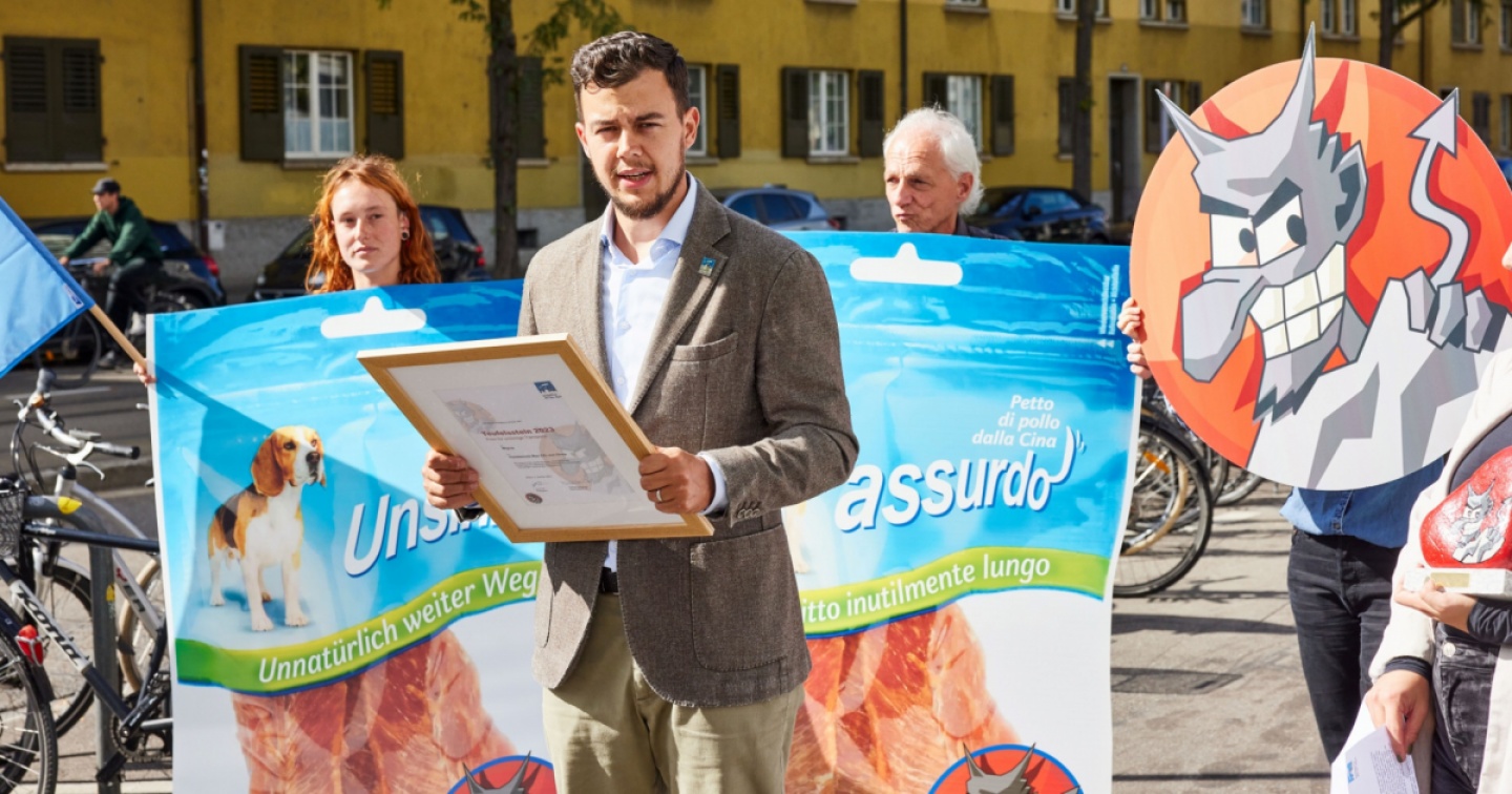 Una folta delegazione di simpatizzanti e collaboratori dell'Iniziativa delle Alpi si è riunita davanti alla sede della Migros a Zurigo per consegnare al dettagliante il premio per il trasporto più assurdo del 2023. «Ogni confezione di snack per cani (petto di pollo secco) dalla Cina emette oltre 100 g di Co2 durante il trasporto, mentre un pollo allevato in Svizzera ne emetterebbe solo 8 g. È un'assurdità assoluta!», ha dichiarato Django Betschart, direttore dell'Iniziativa delle Alpi, nel suo discorso prima della consegna. In vista del cambiamento climatico, è necessario rinunciare ai trasporti inutili, perché «la temperatura media in Svizzera è già aumentata di oltre 2 gradi Celsius», ha aggiunto Nara Valsangiacomo, membro del Comitato dell'Iniziativa delle Alpi.