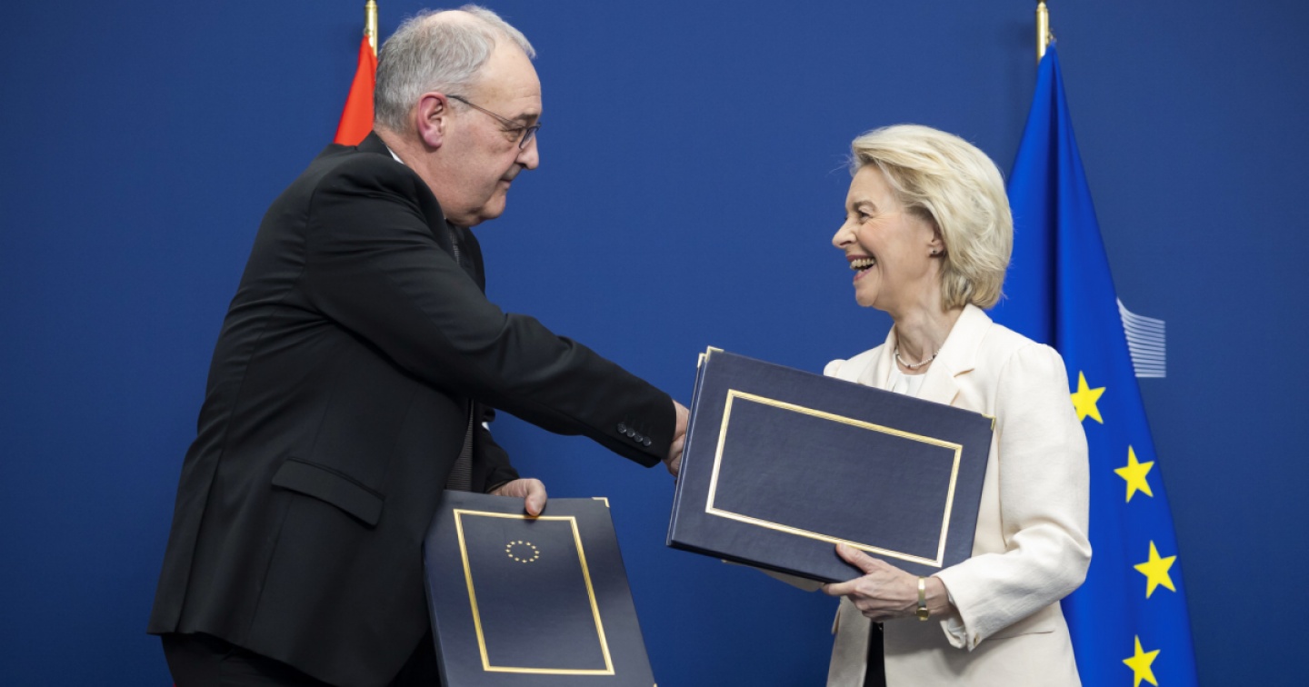 Il presidente della Confederazione Guy Parmelin e la presidente della Commissione europea Ursula von der Leyen hanno firmato oggi a Bruxelles il pacchetto di accordi tra la Svizzera e l'Unione europea (Ue). "È un momento importante per le relazioni bilaterali", ha dichiarato il consigliere federale.