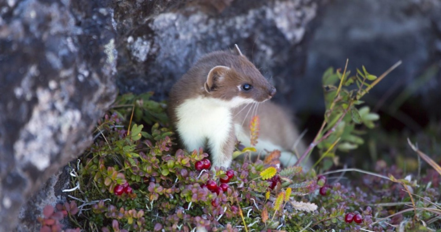 Osservando questo piccolo mammifero dall’aria tenera e innocua, non possiamo fare a meno di pensare ad ampi pascoli innevati. L’ermellino è noto per il suo manto straordinario che, con l’arrivo della stagione fredda, dal marrone estivo si tramuta in un bianco purissimo, e che lo erge di fatto a simbolo del candore invernale. Ma dietro questo musetto grazioso si nasconde un temperamento inaspettatamente focoso! Pochi sanno che l’ermellino è imparentato con puzzole, donnole, martore e faine, astuti ed energici carnivori della famiglia dei mustelidi che, tra l’altro, condividono la capacità di rilasciare un secreto repellente tramite delle ghiandole anali maleodoranti. Altrettanto sorprendenti sono le sue abitudini riproduttive. Di natura solitaria, tra aprile e fine giugno gli ermellini si incontrano per l’accoppiamento. La gestazione comincia subito ma si interrompe dopo due settimane, rimanendo in “stand-by” per i dieci mesi successivi. L’arrivo della primavera innesca poi la ripresa della gravidanza, e dopo un mese nascono in media da 3 a 9 piccoli. Grazie a questo trucco bizzarro, chiamato diapausa embrionale, l’ermellino riesce a concentrare parto e concepimento nello stesso periodo, caldo e ricco di cibo.