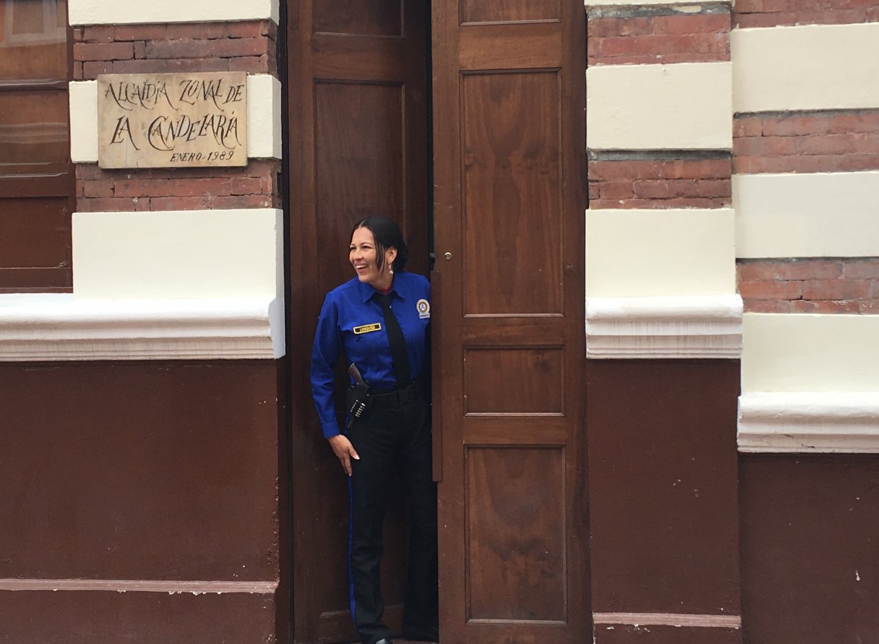 © R. ScarcellaUna poliziotta sorride sulla porta del Municipio della Candelaria a Bogotá