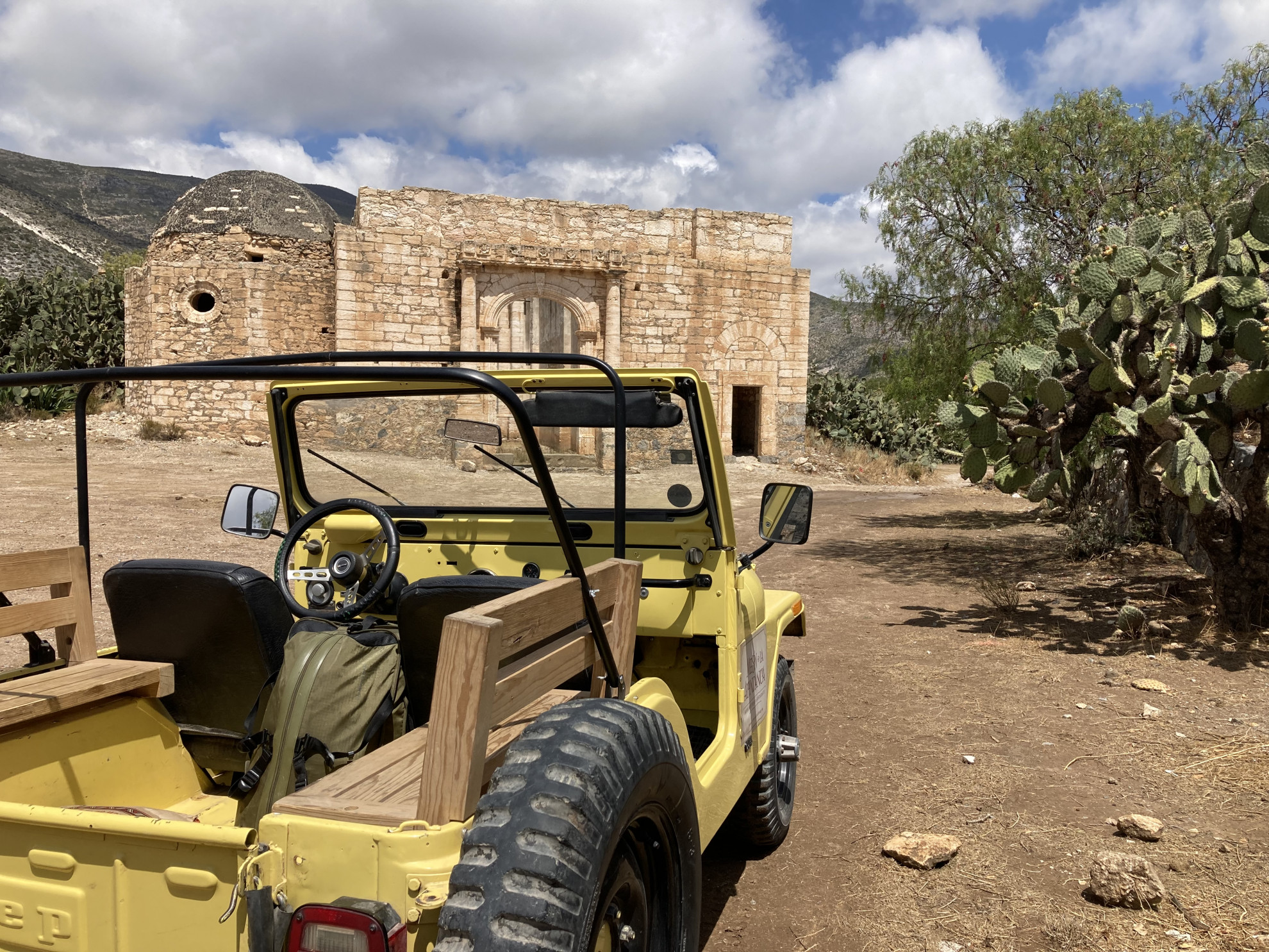 Solo, a bordo di un Willy, una di quelle jeep che sembrano uscite da un cartone animato, verso un quasi-villaggio fantasma in mezzo al deserto