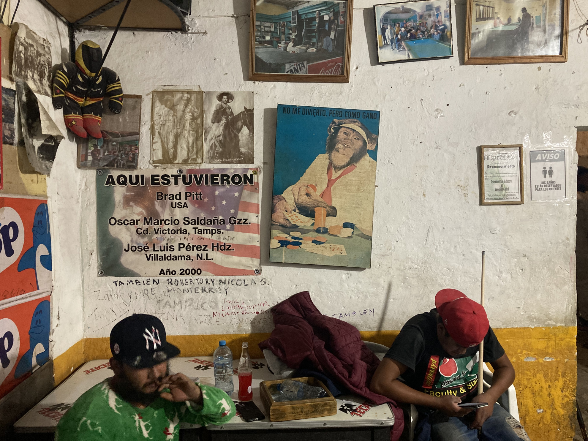 In hotel mi dicono che nel weekend c’è il pienone, ma in settimana, per di più dopo una botta di pioggia inattesa, non c’è praticamente nessuno. Passeggio, entro in una chiesa col vecchio pavimento in legno, compro una cosa che sembra una torta, ma sa di pane, bevo una birra del posto chiamata "El Porvenir" nel locale gestito da un italiano, rientro in hotel per cenare e infine concludo la serata nel solo locale apparentemente aperto, un saloon chiamato "Billar Saldaña" dove gli unici due divertimenti sembrano essere una partita di calcio in una minuscola tv che dimostra cinquant’anni o, appunto, i due biliardi che occupano il salone. Quando entro mi guardano tutti male, ma dopo un po’ la situazione migliora e mi ignorano: ci sono calendari con donne mezze nude, poster di gente in bicicletta, una tv più grande e moderna, ma spenta, la proposta di un provino per un film stampata in caratteri disordinati e un cartello che dice: "Brad Pitt è stato qui". Ed è vero: a Real de Catorce, infatti, hanno girato The Mexican, ma prima ancora alcune scene di Puerto Escondido e Il tesoro della Sierra Madre.