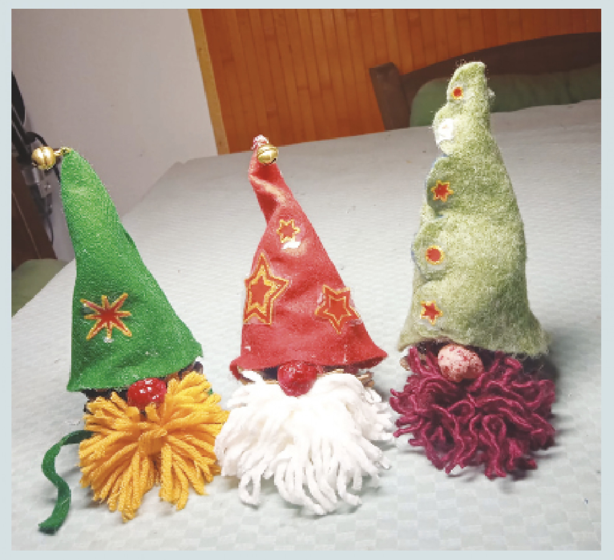 Si veste ogni esemplare con un cappello a cono ottenuto da un triangolo di panno lenci. Si applica un naso rubizzo fatto di una pallina colorata, mentre la folta barba non è che un pon- pon di lana. Non per forza di cose bianca, perché i nostri nanetti hanno gusti molto pop...