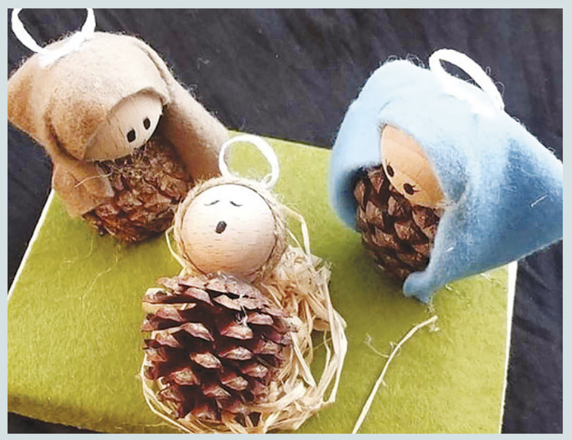 Bastano tre pigne di diverse misure. La più piccola diventa il Bambin Gesù, la più grande il buon Giuseppe, la media sarà mamma Maria. A ognuna si incolla sulla cima una pallina di legno per fare la testa e si vestono rispettivamente con un brindello di stoffa bianca, poi un rettangolo di panno marrone e uno azzurro entrambi a mo’ di mantello. Adagiato il bambinello su un po’ di paglia, l’atmosfera sarà perfetta.