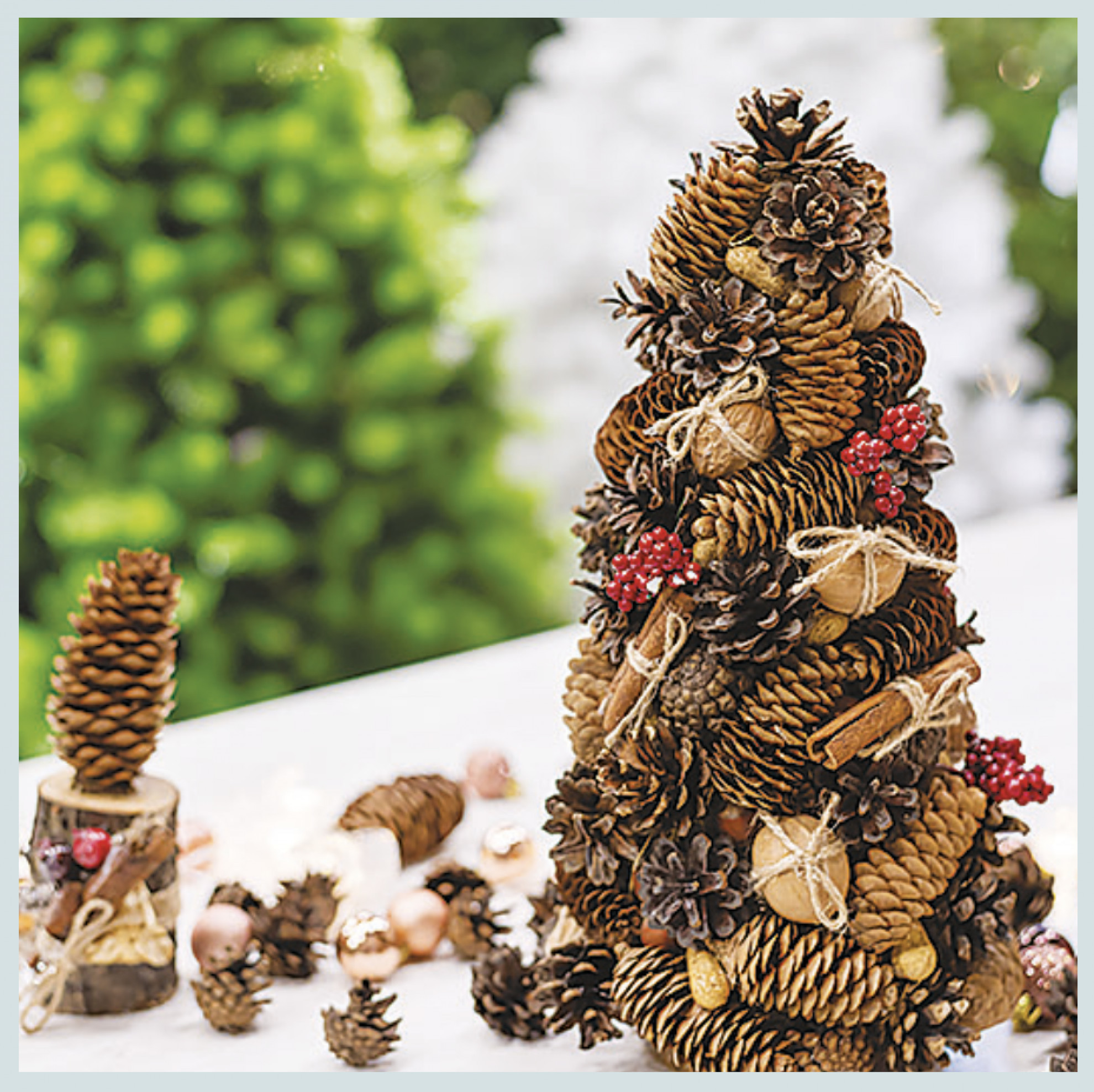 Stufi degli abeti finti e di quelli veri che sopravvivono a malapena fino all’Epifania? Ne possiamo creare uno tutto naturale dal profumo di resina e pinoli. Su un cono di cartone si attaccano le pigne con la colla a caldo, partendo dalla base con quelle più grandi e procedendo fino alla cima con quelle via via più piccine. Basta procurarsene una certa quantità...