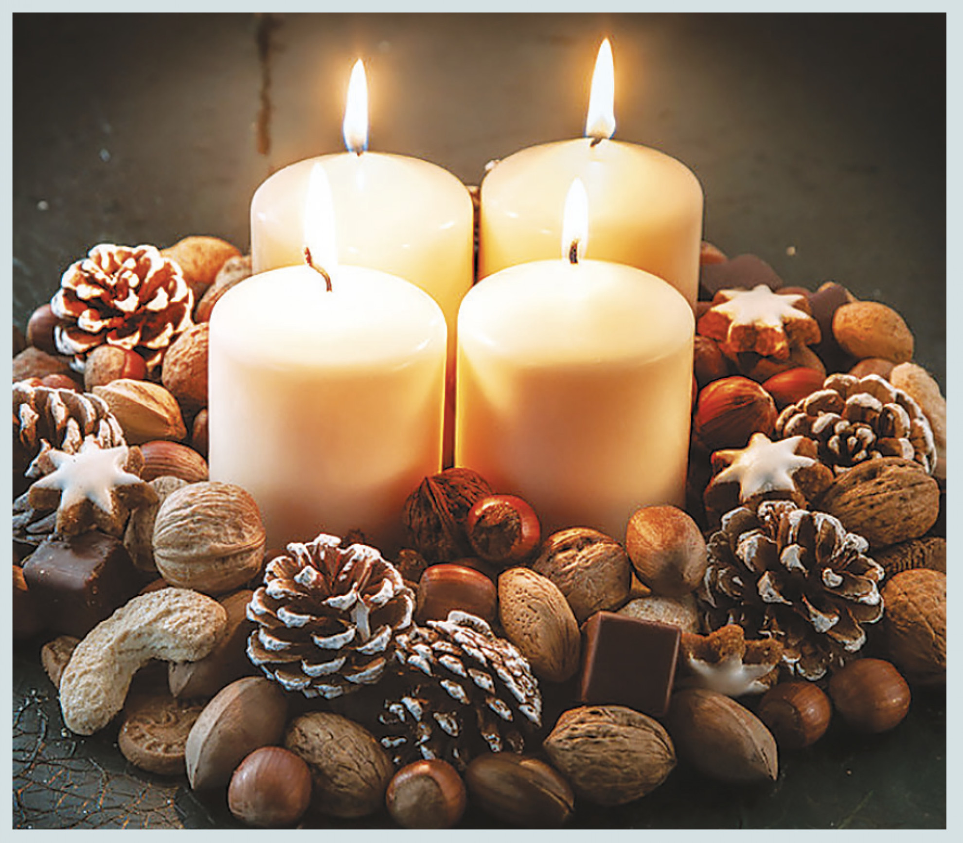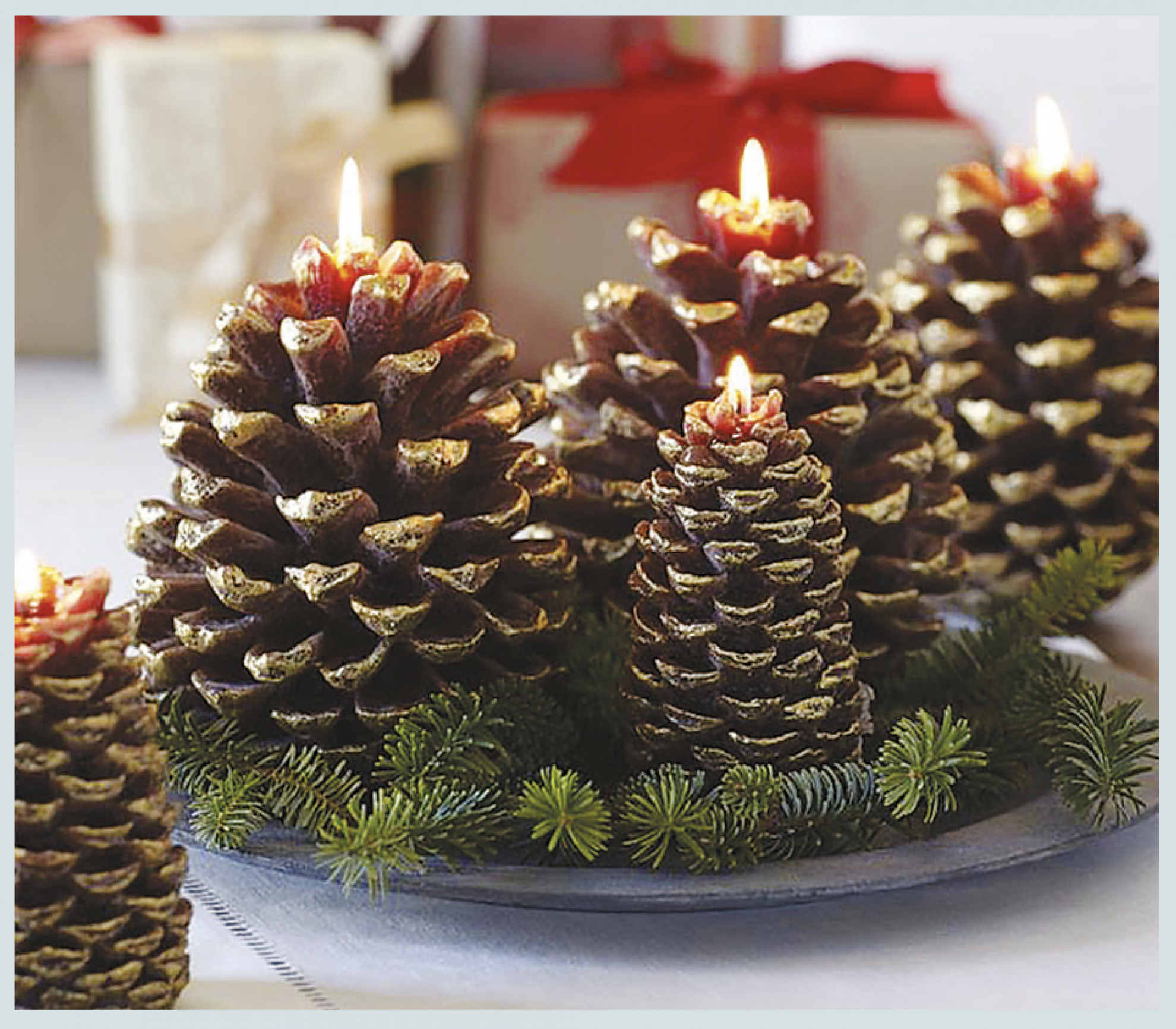 Ma che feste natalizie sarebbero senza la presenza di qualche candela a illuminare la tavolata? Realizzare qualche bugia con le pigne è semplicissimo. Con una pinza si tolgono le brattee superiori e con una cesoia si elimina il moncone centrale ed eccole, pronte per accogliervi, le candele da posizionare perfettamente verticali.
