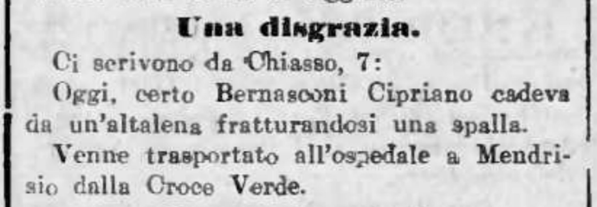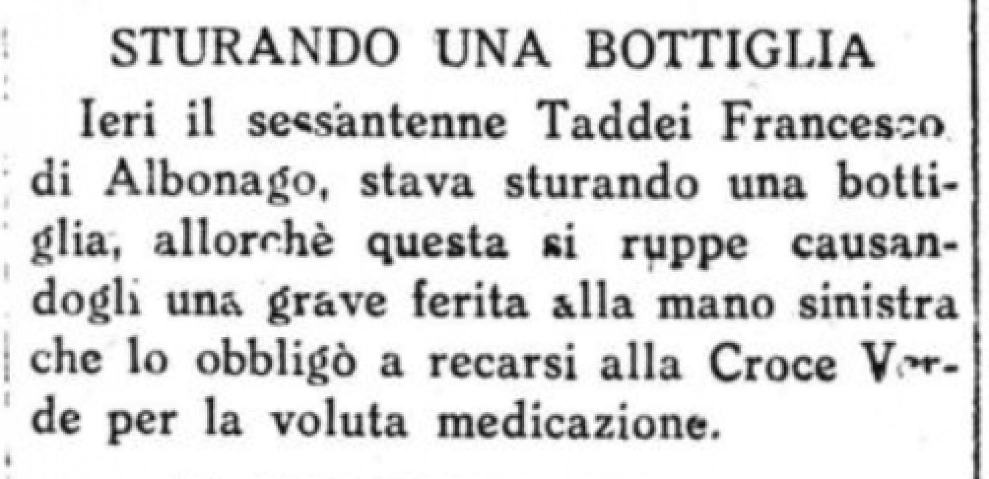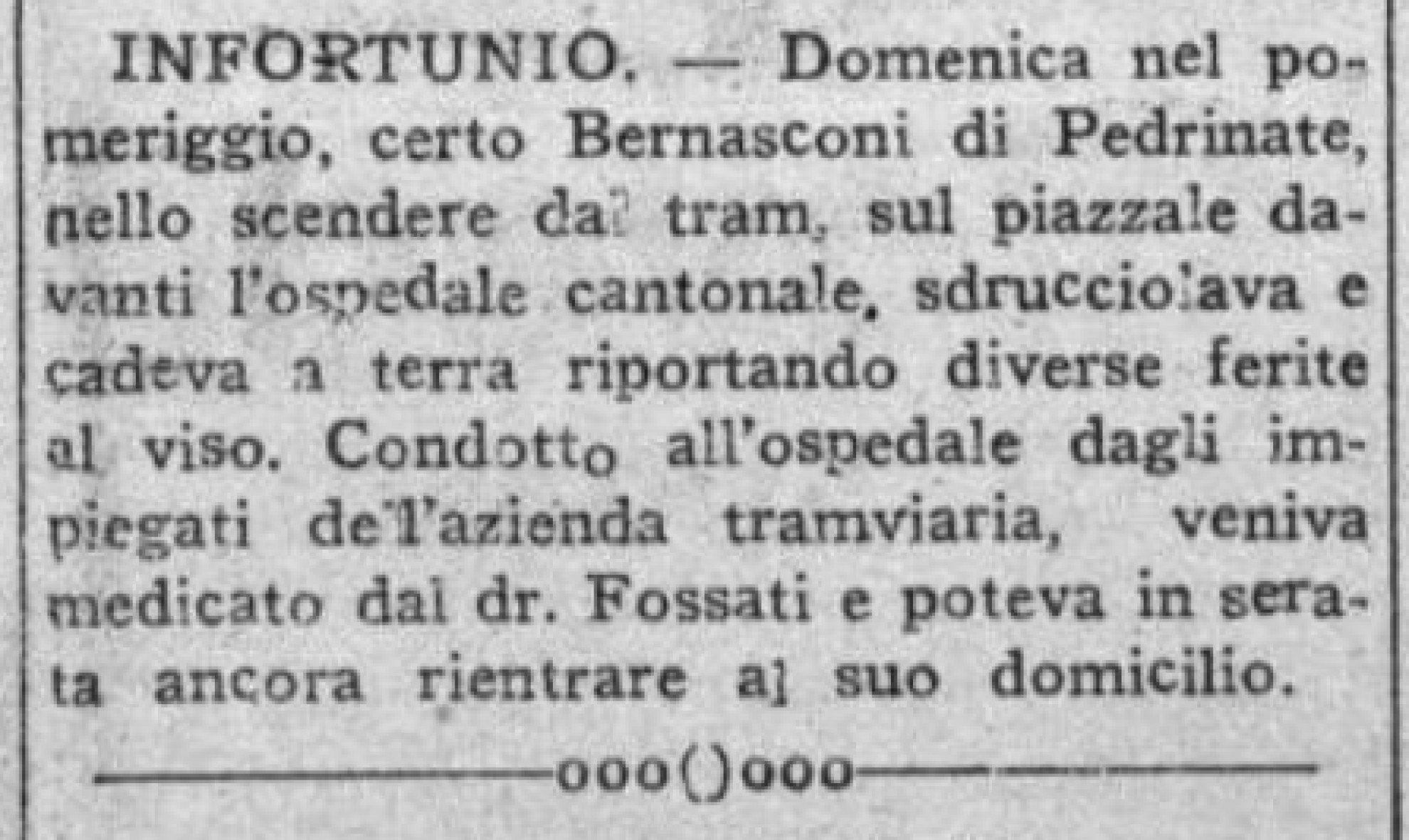 Interessante, per cominciare, l’incidente occorso nel 1924 al signor Francesco Taddei di Albonago, il quale – come da titolo – riuscì a ferirsi una mano "sturando una bottiglia", per poi recarsi alla "Croce Verde" per la "voluta medicazione". Attenzione, non "dovuta", bensì, "voluta". Il Taddei evidentemente sapeva il fatto suo e riservava verosimilmente la stessa irruenza a bottiglie e personale sanitario. Nella sfortuna, andò piuttosto bene a "certo Bernasconi di Pedrinate" che nel 1929 sdrucciolò e cadde scendendo dal tram proprio davanti all’ospedale di Mendrisio, dove venne immediatamente accompagnato dai tramvieri. Poté rientrare tranquillamente al suo domicilio la sera stessa, grazie alle dovute (immaginiamo) cure del dottor Fossati. Se la cavò invece con una frattura alla spalla un altro Bernasconi – Cipriano – che immaginiamo giovanissimo (nel 1912),