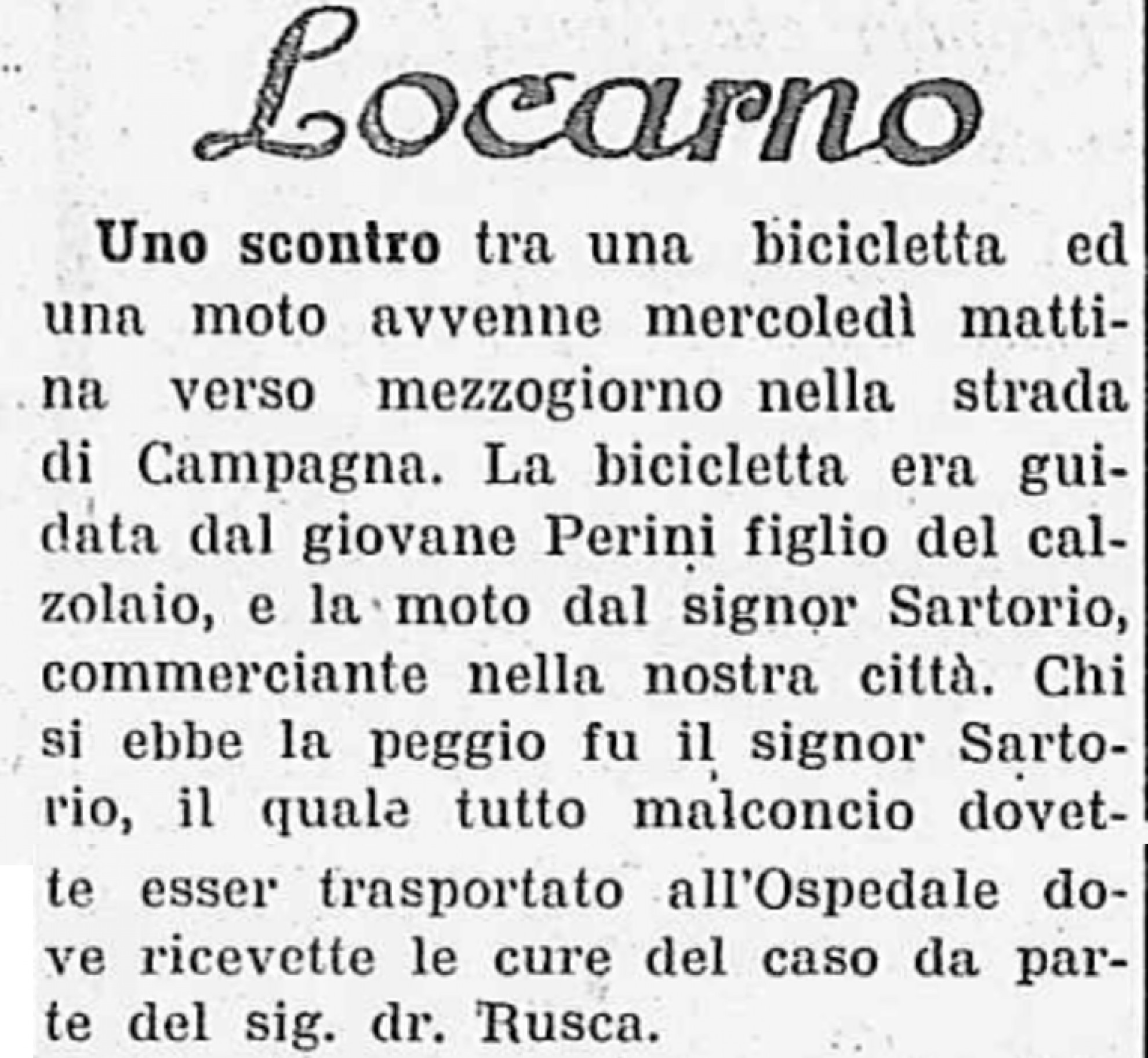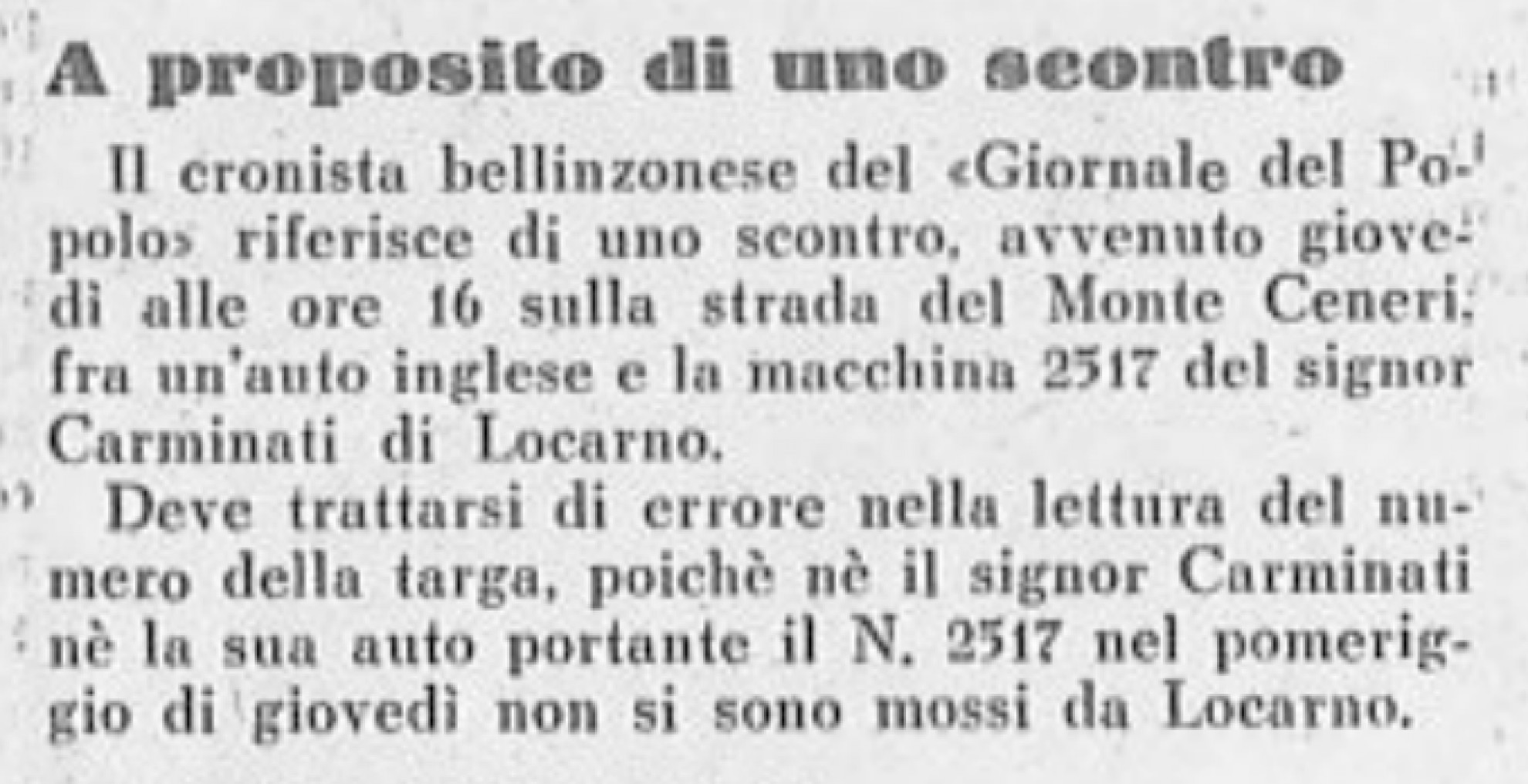 Curiosa in questo ambito è una vicenda in cui rimase coinvolto nel 1937 un tale "signor Carminati" di Locarno, che il Giornale del Popolo sosteneva essersi scontrato con un’auto inglese sulla vecchia strada del Ceneri. Senonché, il giorno seguente, l’Eco di Locarno smentiva, sostenendo che il loro concittadino e la sua auto targata ‘2517’ non si erano mossi quel giorno dalla città sul Verbano. Difficile stabilire oggi se si sia trattato effettivamente di un errore o se un guidatore inglese e l’inesistente senso della privacy di allora abbiano giocato un brutto tiro al Carminati mentre si trovava da quelle parti "in incognito"… "Quando un uomo con la moto si scontra con un uomo con la bicicletta, quello con la moto ne esce tutto malconcio", è il motto sergioleoniano che viene alla mente leggendo della disavventura che ha visti coinvolti, sempre a Locarno, il commerciante Sartorio e il giovane Perini figlio del calzolaio, evidentemente di tempra robusta.