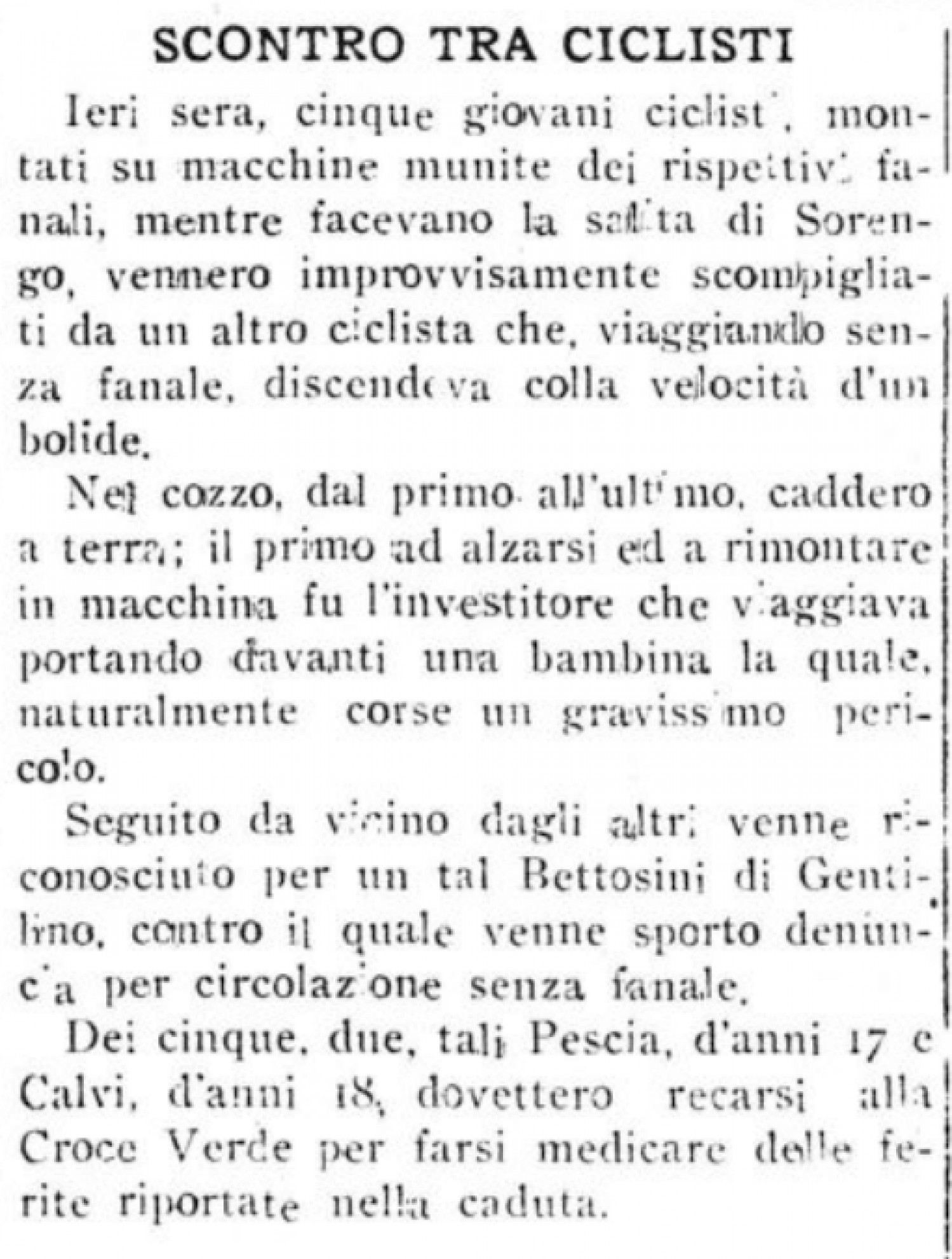 Un altro poderoso scontro, questa volta tra soli ciclisti, ha avuto luogo invece a Sorengo nel 1924, quando "un tal Bettosini di Gentilino" , lanciato in discesa "colla velocità di un bolide", "scompigliò" come birilli cinque giovani ciclisti che arrancavano in salita. Si noti che l’imprudente velocista, in quell’occasione, "portava davanti una bambina" (!) e viaggiava senza fanale (circostanza, quest’ultima, che gli valse una denuncia).