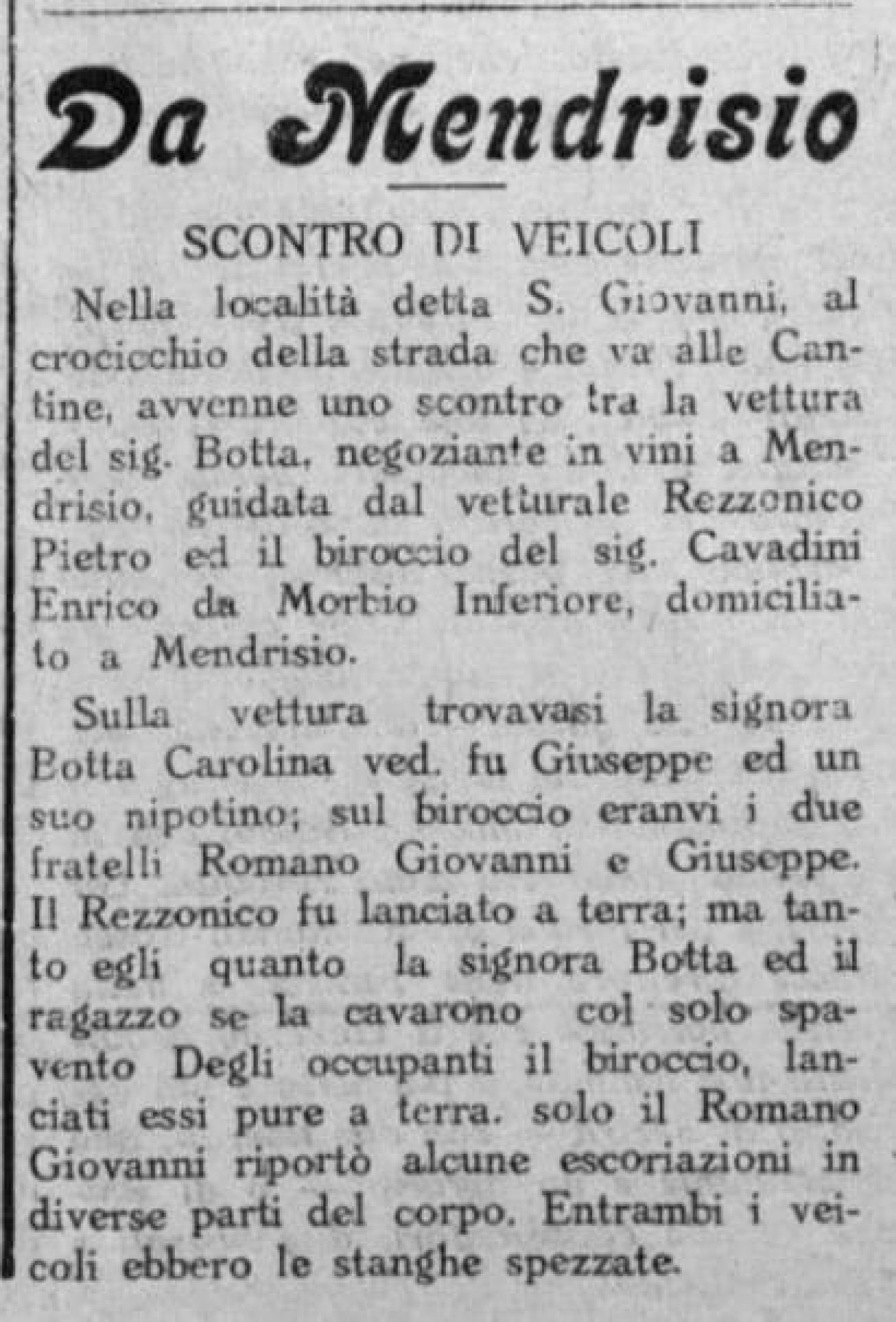 Due anni dopo, un altro scontro rocambolesco avviene in zona San Giovanni a Mendrisio, coinvolgendo supergiù mezzo Mendrisiotto. La prima vettura coinvolta apparteneva al vinattiere Botta, era guidata dal suo dipendente Pietro Rezzonico e a bordo portava la signora Carolina Botta con un suo nipotino. La seconda era invece il "biroccio" del signor Enrico Cavadini, condotto però dai fratelli Giovanni e Giuseppe Romano. Furono un po’ tutti "lanciati a terra" ma se la cavarono "col solo spavento". Peggio andò ai veicoli, che ebbero entrambi "le stanghe spezzate".