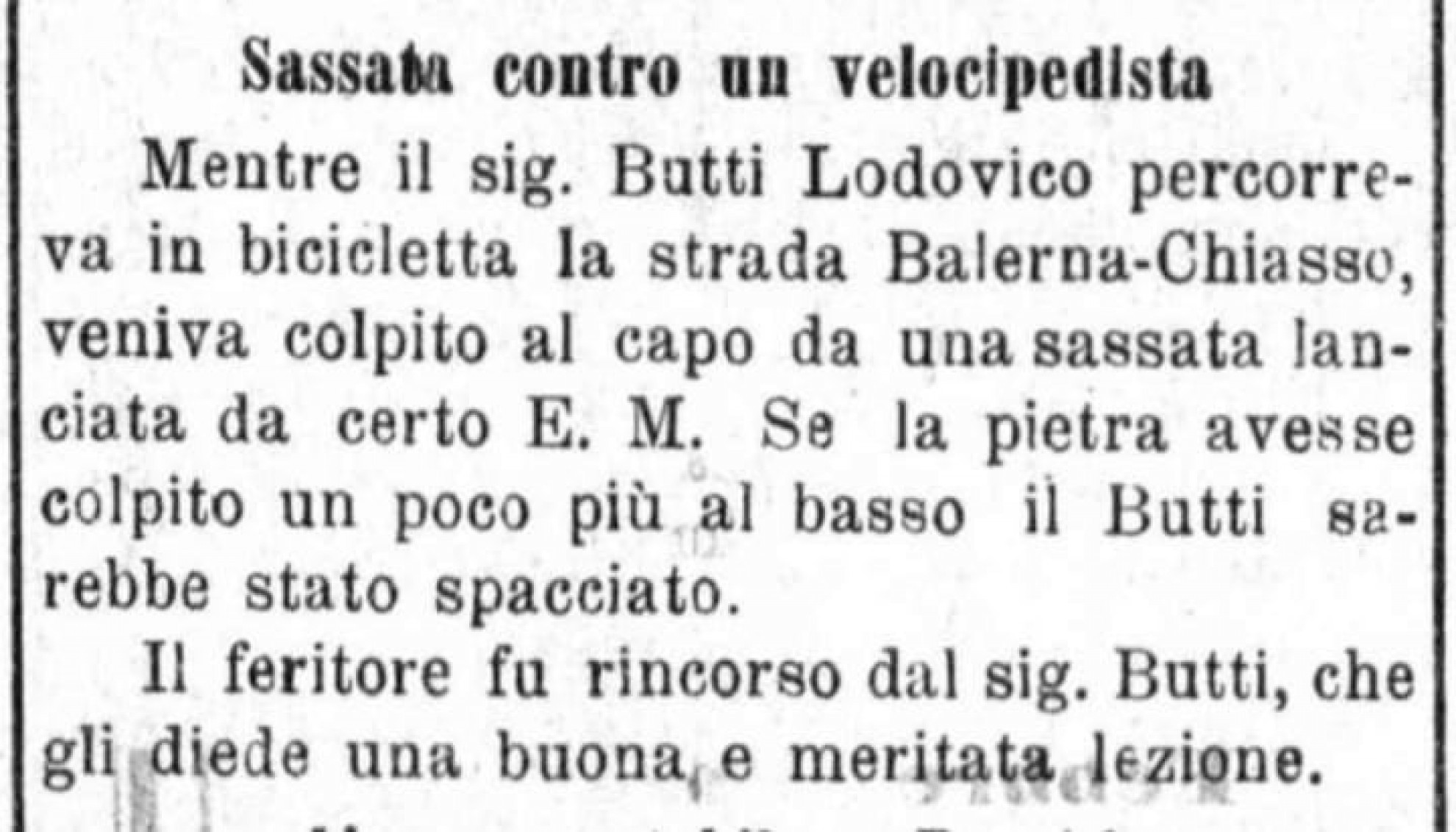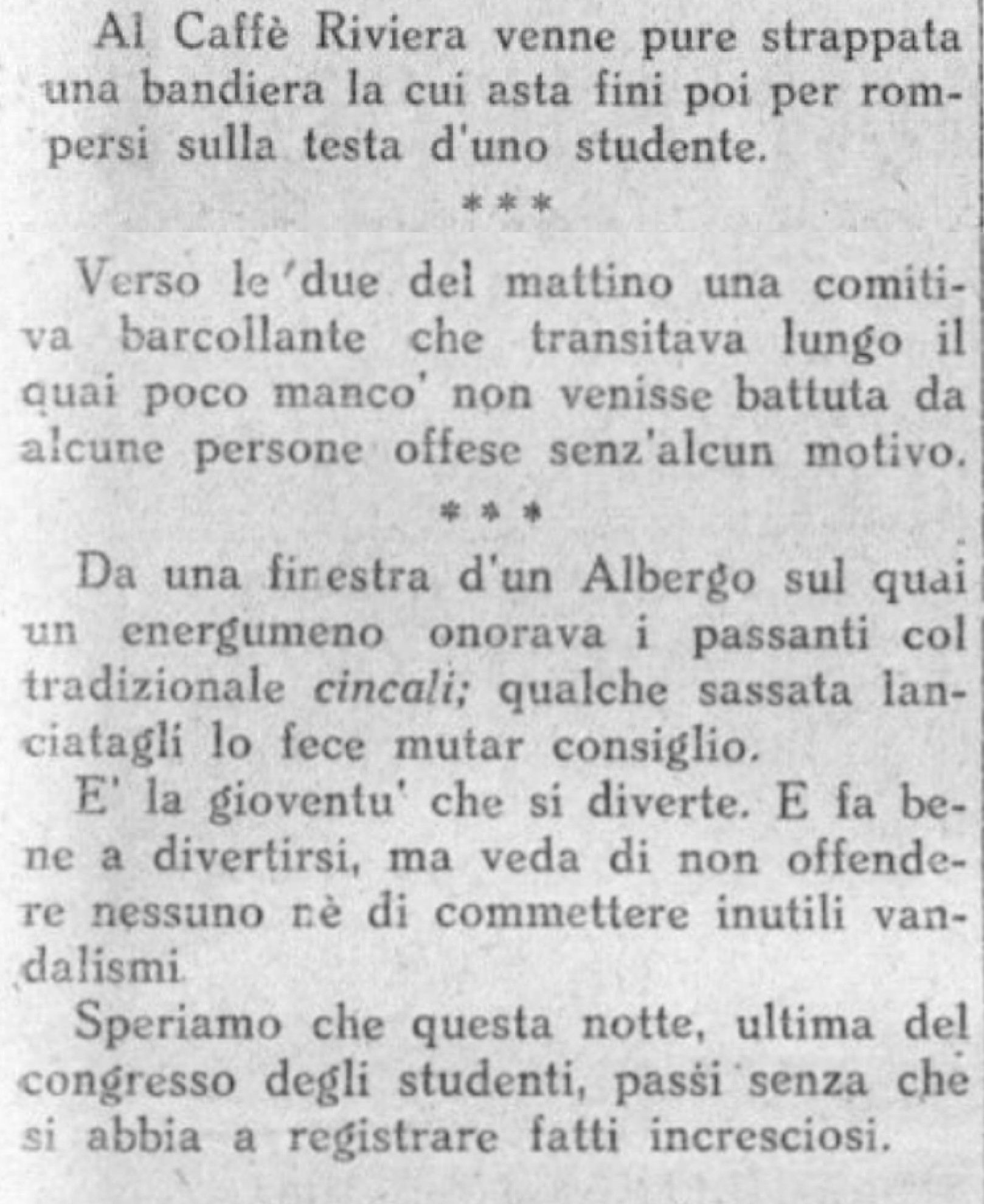 Per tornare alle goliardate, Gazzetta ticinese descrive le seguenti: - "Al Caffè Riviera venne strappata una bandiera la cui asta finì poi per rompersi sulla testa di uno studente". Singolare la vicenda di quest’asta che apparentemente motuproprio va a infrangersi su un nibelungico capo. Viene il dubbio che forse una certa ostilità tra partecipanti al convegno e cittadini luganesi abbia avuto una parte in questa circostanza. Tanto più che tra le altre "mattane" descritte da Gazzetta ticinese troviamo quanto segue: - "Verso le due del mattino una comitiva barcollante che transitava lungo il quai poco mancò non venisse battuta da alcune persone offese senz’alcun motivo". E infine (e qui siamo sul pirotecnico): - "Da una finestra d’un Albergo sul quai un energumeno onorava i passanti col tradizionale ‘Cincali’; qualche sassata lanciata lo fece mutar consiglio". Vittima anch’egli di una "sassata" è stato il "velocipedista" Lodovico Butti, intento a scendere da Balerna a Chiasso. Tanto sfortunato quanto intraprendente, riuscì comunque a rincorrere e raggiungere un non meglio specificato E.M. (molti commentatori social odierni schiumerebbero rabbia, pretendendo "nome e cognomeeeh!" del responsabile) per dargli una "buona e meritata lezione".