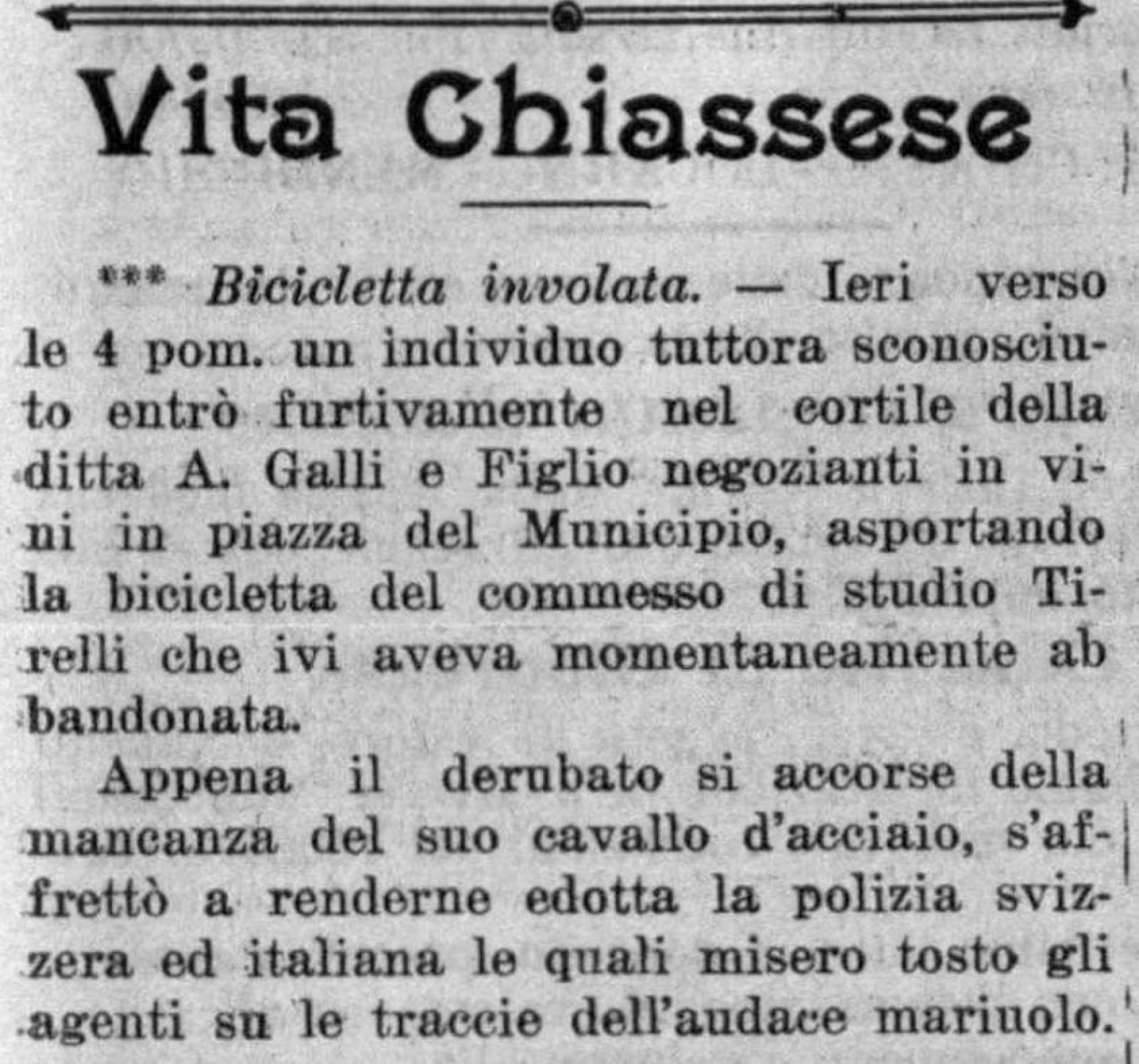 Altro ciclista chiassese, altra disavventura: nel 1912 Gazzetta ticinese si occupa del giovane Tirelli, il cui "cavallo d’acciaio" venne asportato da un individuo entrato furtivamente nel cortile della ditta dove lavorava. Non si sa come si sia conclusa la vicenda, lascia tuttavia ben sperare il fatto che la polizia svizzera e quella italiana "misero tosto gli agenti su le tracce dell’audace mariuolo". Singolare anche una doppia cronaca, pubblicata sempre da Gazzetta ticinese nel 1928 e ambientata in due pollai del Locarnese. Quello del signor Mario Stefanini, dapprima, vittima dei "soliti malfattori" (ladri di polli, letteralmente), i quali, colti sul fatto dallo Stefanini, "fecero appena in tempo a sfuggire alle sue legnate".