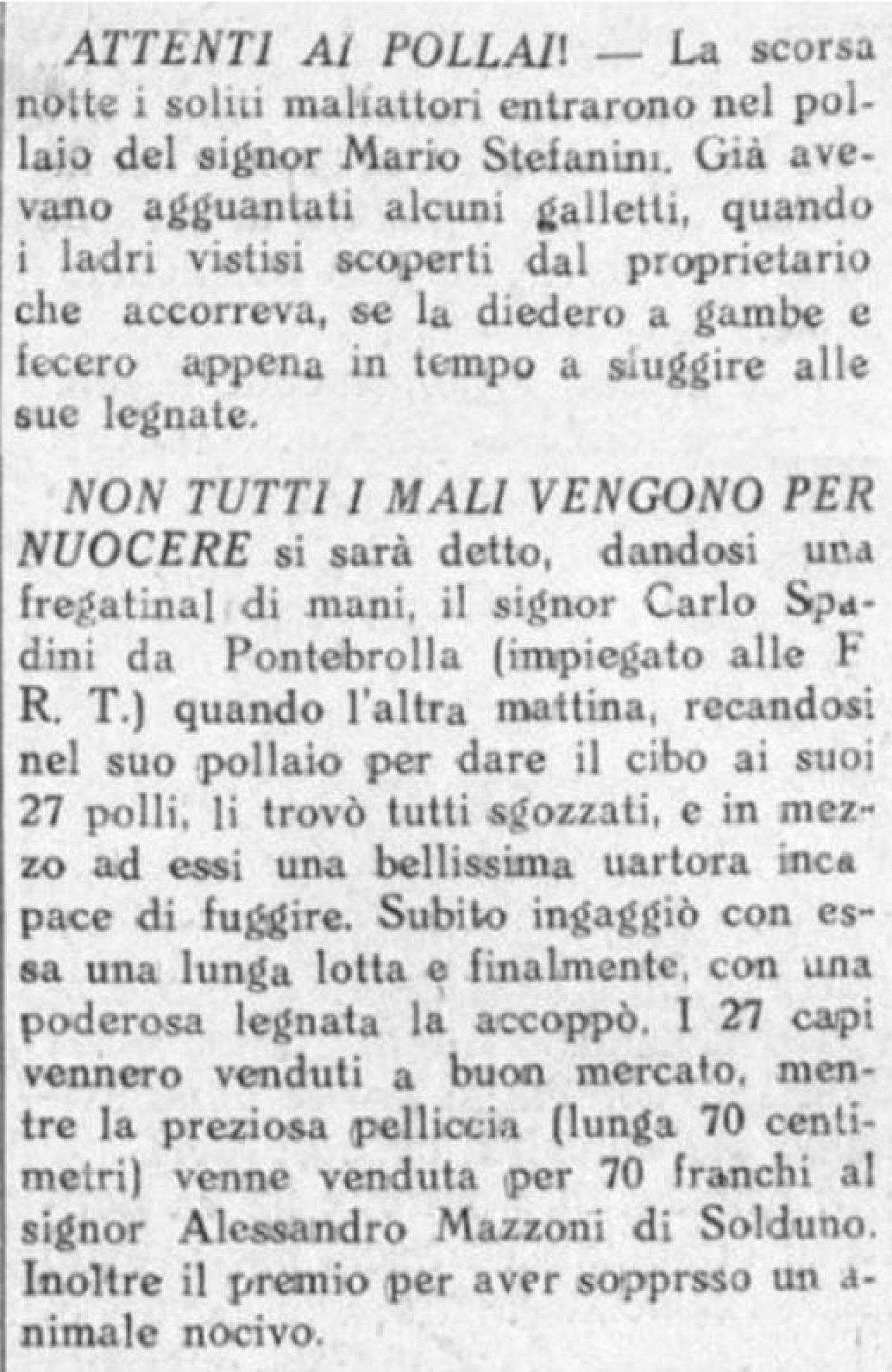 Chi invece quel tempo non l’ha trovato – risulta dalla seconda nota di cronaca – è la povera martora sorpresa nel pollaio del signor Carlo Spadini, ferroviere di Pontebrolla (o Ponte Brolla), accoppata con una "poderosa legnata". Un grande affare per lo Spadini, che oltre a intascare un "premio per aver soppresso un animale nocivo", venderà la pelliccia della martora a tale Alessandro Mazzoni, che, sborsando per tale trofeo ben 70 franchi dell’epoca, doveva essere noto a Solduno e dintorni più per la ricchezza che per la scaltrezza. Decisamente scaltro invece il misterioso malfattore di cui si riferiva nel 1901, il quale soleva condurre "donnine eleganti" milanesi "in Isvizzera" , chiedendo poi loro di indossare sottovesti imbottite di sigari e sigarette da contrabbandare prima di attraversare la frontiera al ritorno.