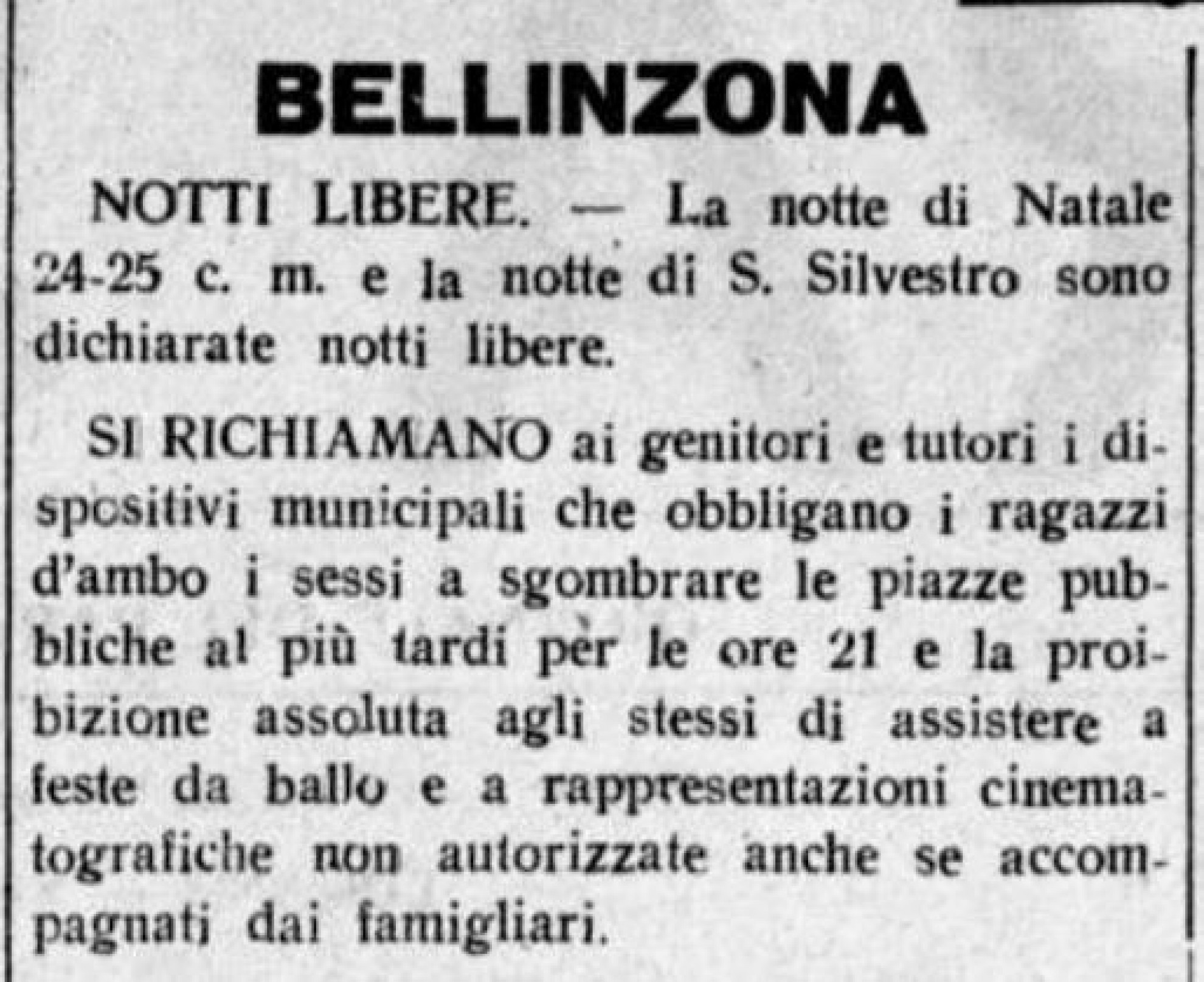 Per concludere, destano molte curiosità le regole diramate dal Municipio di Bellinzona a margine delle "notti libere" indette per il Natale (attenzione: "Natale", no "Carnevale") del 1929. Riportiamo testualmente: "Si richiamano ai genitori e tutori i dispositivi municipali che obbligano i ragazzi d’ambo i sessi a sgombrare le piazze pubbliche al più tardi per le ore 2 e la proibizione assoluta agli stessi di assistere a feste da ballo e a rappresentazioni cinematografiche non autorizzate anche se accompagnati dai famigliari".