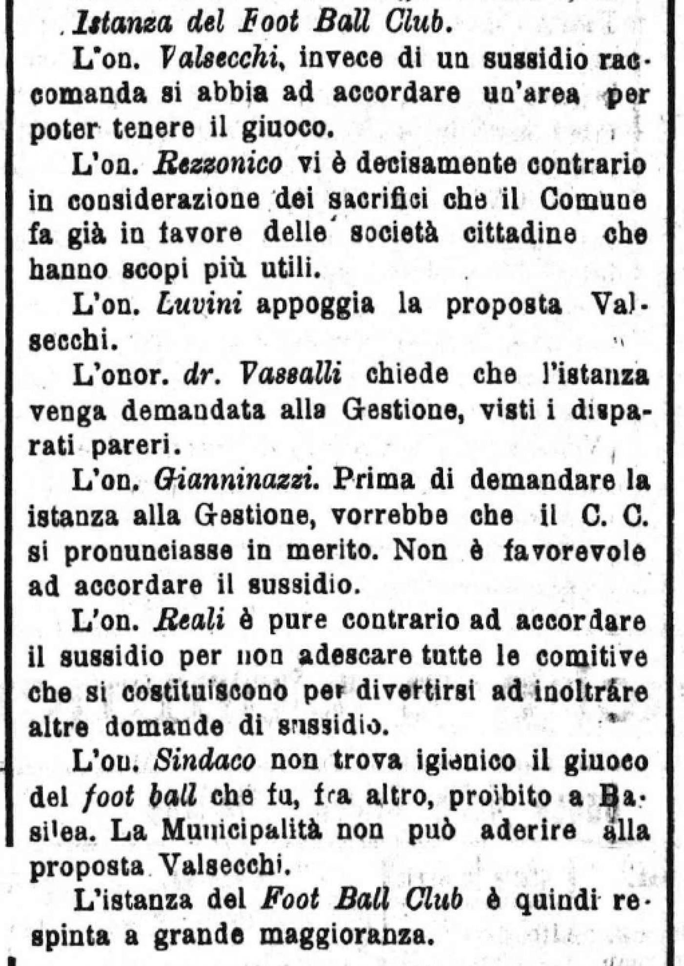 Possiamo iniziare dal verbale di una seduta del Consiglio comunale della città di Lugano, pubblicato su "Gazzetta ticinese" nel 1905. Tra i temi in discussione c’era una "istanza del Foot Ball Club" in cui si chiedeva alle autorità cittadine di "accordare un’area per poter tenere il giuoco". Parte una discussione tra favorevoli e soprattutto contrari, i quali ricordano gli sforzi che il Comune già fa "in favore di società cittadine che hanno scopi più utili" e mettono in guardia sul rischio di "adescare tutte le comitive che si costituiscono per divertirsi a inoltrare altre domande di sussidio". La discussione viene chiusa in modo lapidario dall’allora sindaco (l’avvocato Elvezio Battaglini), il quale "non trova igienico il giuoco del foot ball". Istanza respinta a grande maggioranza. Punto e a capo.