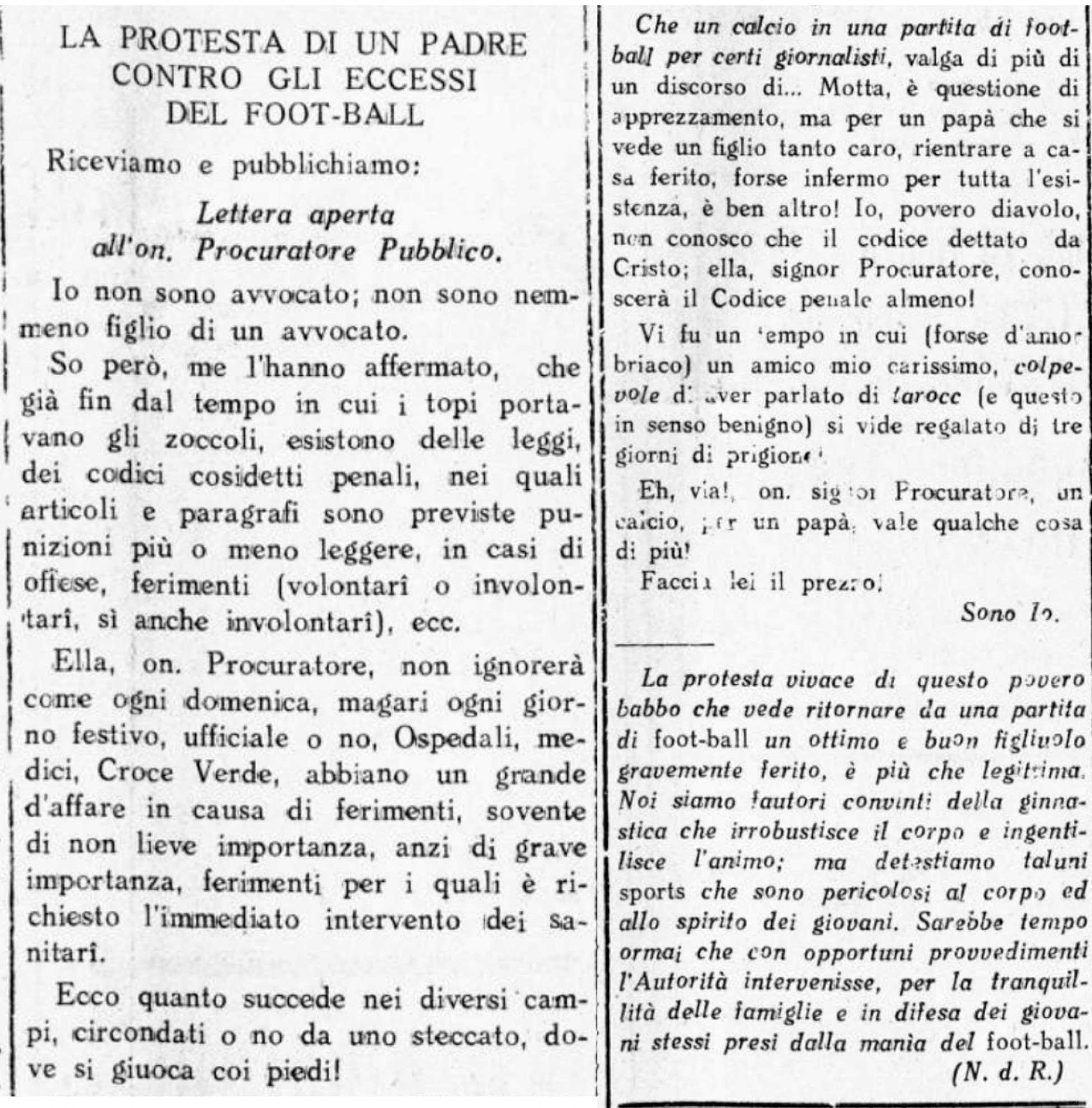 L’accorata missiva del genitore non lascia indifferenti i redattori della testata socialista, che aggiungono in calce questa nota, ricca di spunti interessanti su come veniva percepito allora il calcio in rapporto ad altri sport: "La protesta vivace di questo povero babbo che vede ritornare da una partita di foot-ball un ottimo e buon figliuolo gravemente ferito, è più che legittima. Noi siamo fautori convinti della ginnastica che irrobustisce il corpo e ingentilisce l’animo; ma detestiamo taluni sports che sono pericolosi al corpo ed allo spirito dei giovani. Sarebbe tempo ormai che con opportuni provvedimenti l’Autorità intervenisse, per la tranquillità delle famiglie e in difesa dei giovani stessi presi dalla manìa del foot-ball".
