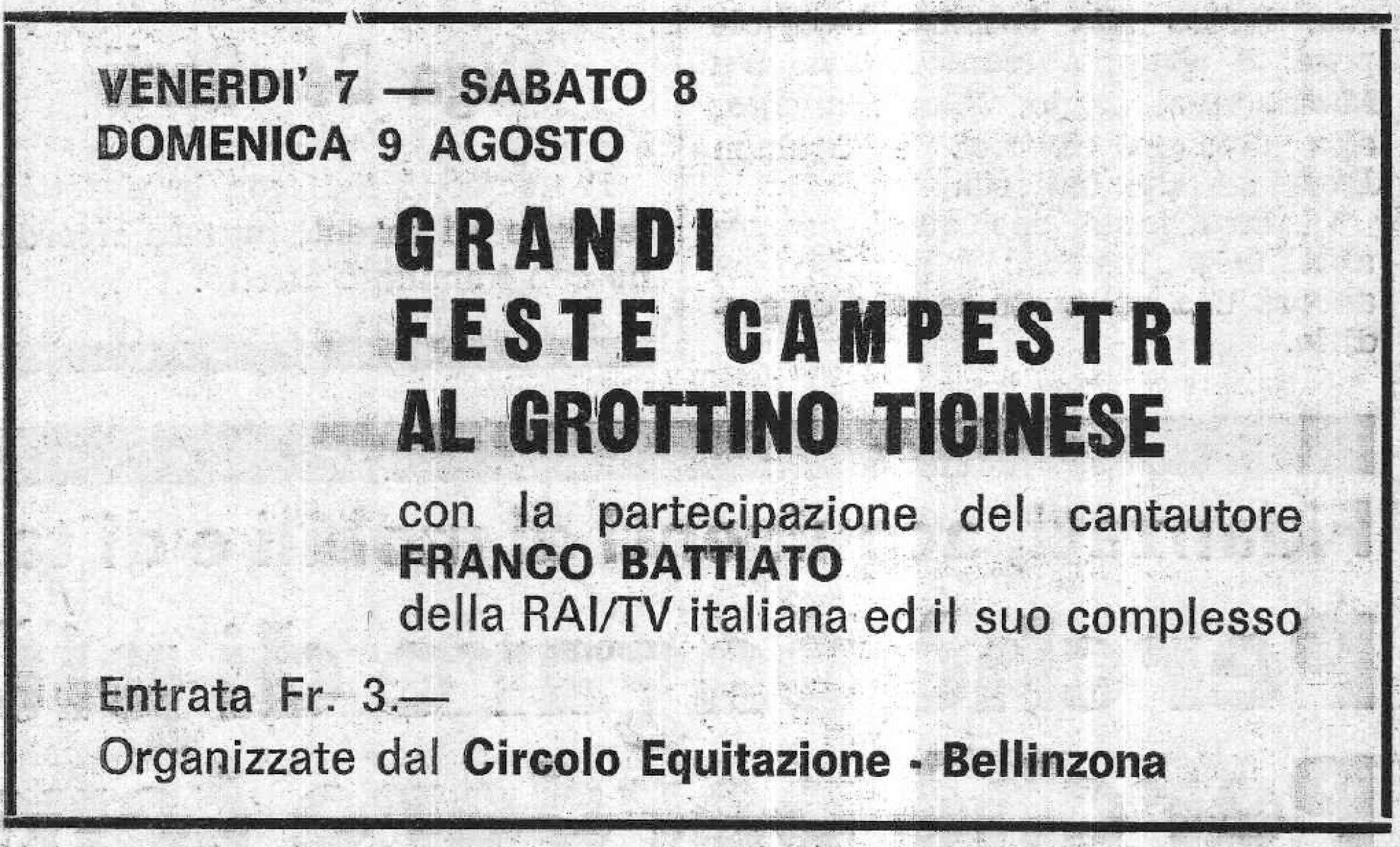 Per concludere con note più edificanti e leggere, possiamo passare agli eventi che le società sportive, anche in Ticino, hanno sempre organizzato per finanziarsi. Serate danzanti, risottate, tombole, sagre … Rientra in questo ricco ambito anche la serata promossa dal Circolo Equitazione di Bellinzona nell’agosto del 1970. Una serata con musica dal vivo al Grottino Ticinese. Niente di particolare, apparentemente, se non fosse che a dispensare note, quella sera, fu chiamato un tale Franco Battiato. Il poliedrico artista siciliano, allora, era noto per alcune partecipazioni a programmi tv RAI e aveva inciso solo una manciata di singoli (i "45 giri" del tempo). La sua carriera discografica ufficiale inizierà infatti solo due anni più tardi, con la combo ultrasperimentale composta dagli LP ‘Fetus’ (1972) e ‘Pollution’ (1973). Viene quindi da chiedersi che cosa possa mai aver presentato quella sera, per le feste campestri del circolo ippico.