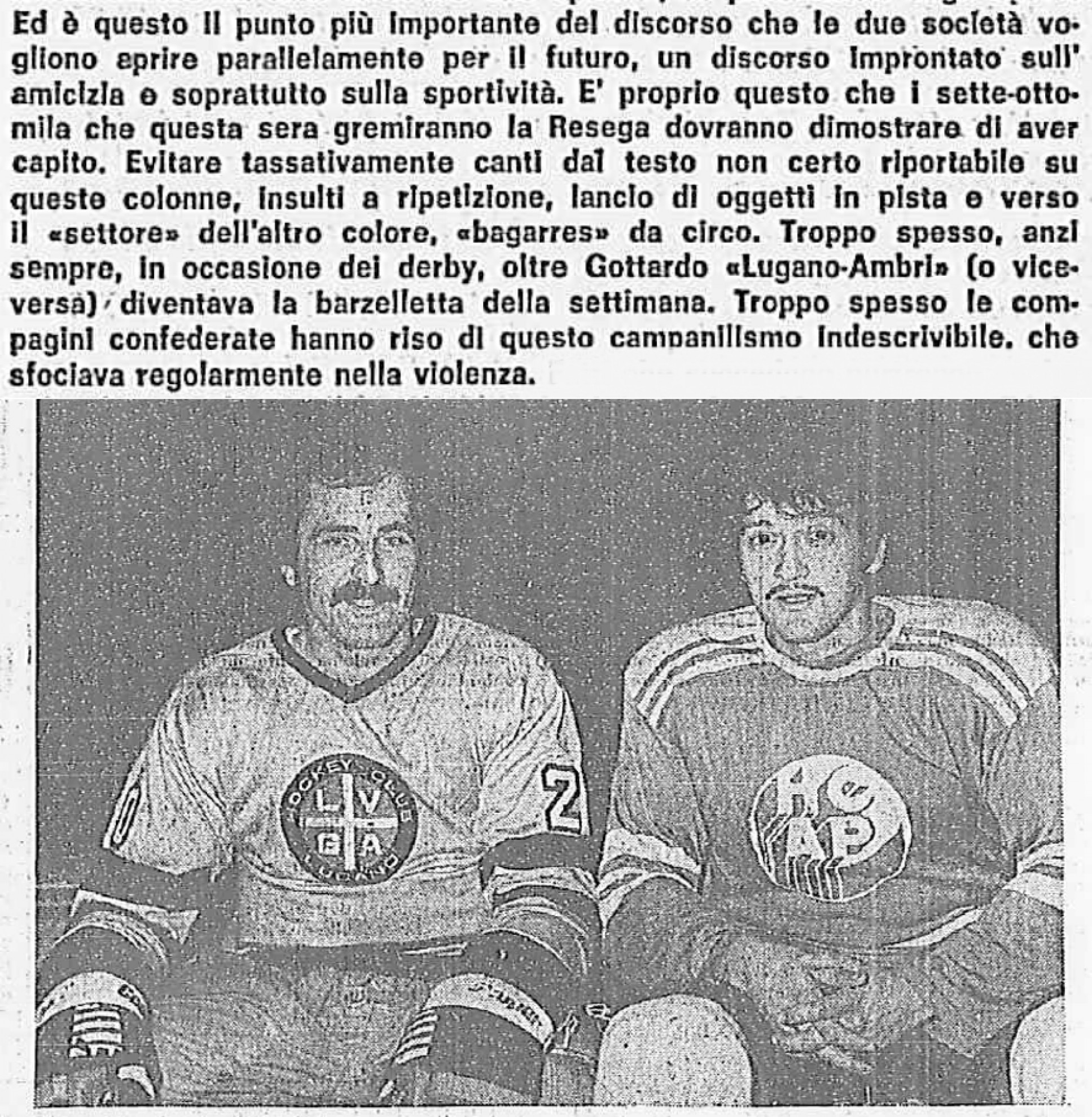 E ora veniamo alla sfida stracantonale per eccezione: i derby hockeistici tra Lugano e Ambrì Piotta. Essendo questa una rubrica storica, scegliamo, tra i tanti, un episodio risalente a 50 anni fa. Il 23 gennaio del 1973, alla Resega, succede davvero di tutto. Per i dettagli possiamo senz’altro lasciare la parola al cronista del "Giornale del Popolo": "Che pena. È questo, assieme ad una certa nausea, il sentimento che abbiamo provato al termine del più brutto ed anti-sportivo derby che la storia dell’hockey ticinese ricordi. (…) Il normale antagonismo misto ad un comprensibile campanilismo che dovrebbero regnare tra Ambrì e Lugano ed i loro supporter, sono stati sostituiti questa sera da un cannibalismo verbale e... pratica che non ha riscontri su altre piste e che ha disonorato lo sport ed i veri sportivi ticinesi, a cominciare dal pubblico, maleducato e incline alla ‘guerra civile’ con lancio di bottiglie sul ghiaccio e continui accenni di pugilato. Tutti in questo ‘derby’ hanno perso la tramontana. Persino i dirigenti delle due formazioni, che in passato avevano sempre fortunatamente mantenuto un atteggiamento realisticamente costruttivo, sono venuti stavolta alle mani: uno spettacolo da non credere. Dei giocatori è meglio parlare poco. Diversi infatti, dimentichi della non certo esaltante prova fornita, hanno scambiato il ghiaccio per un ring ed oltre ai colpi proibiti dati durante l’incontro, si sono resi protagonisti del ‘capolavoro western’ finale. Una cosa da non credere: al suono della sirena si sono visti giocatori rincorrersi a prendersi a cazzotti, giovani entrare in pista per partecipare alla rissa, scalmanati aggredire un arbitro. Il tutto è poi continuato all’esterno della pista e nei corridoi che conducono agli spogliatoi. Di spettacoli come quello visto alla Resega speriamo non se ne vedano più: in caso contrario molto meglio sarebbe chiudere baracca e burattini: e state certi che nessuno ne rimpiangerebbe la scomparsa".