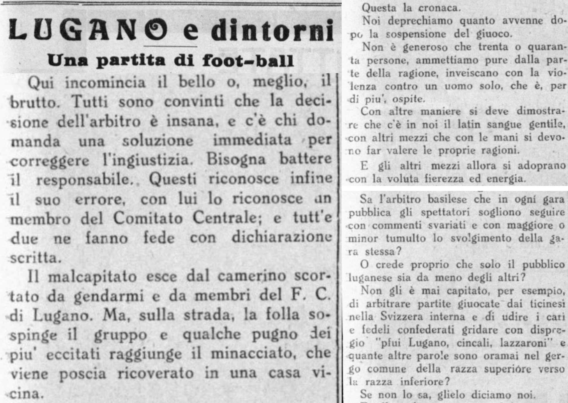 Ben al di là dei fatti così esposti, "Gazzetta ticinese" si addentra nelle seguenti interpretazioni e considerazioni: "Noi deprechiamo quanto avvenne dopo la sospensione del giuoco. Non è generoso che trenta o quaranta persone, ammettiamo pure dalla parte della ragione, inveiscano con la violenza contro un uomo solo, che è, per di più, ospite". Questa la posizione assunta dalla testata, peraltro usando l’ottimo rafforzativo "inveire con la violenza", ma l’articolo poi vira ulteriormente, fino ad assumere una sorprendente piega etnico-regionalistico-rivendicativa, in questo modo: "Con altre maniere si deve dimostrare che c’è in noi il latin sangue gentile [sic!], con altri mezzi che con le mani si devono far valere le proprie ragioni. E gli altri mezzi allora si adoprano con la voluta fierezza ed energia. Crede proprio l’arbitro che solo il pubblico luganese sia da meno degli altri? Non gli è mai capitato, per esempio, di arbitrare partite giuocate dai ticinesi nella Svizzera interna e di udire i cari e fedeli confederati gridare con dispregio ‘pfui Lugano, cincali, lazzaroni’ e quante altre parole sono oramai nel gergo comune della razza superiore verso la razza inferiore? Se non lo sa, glielo diciamo noi".