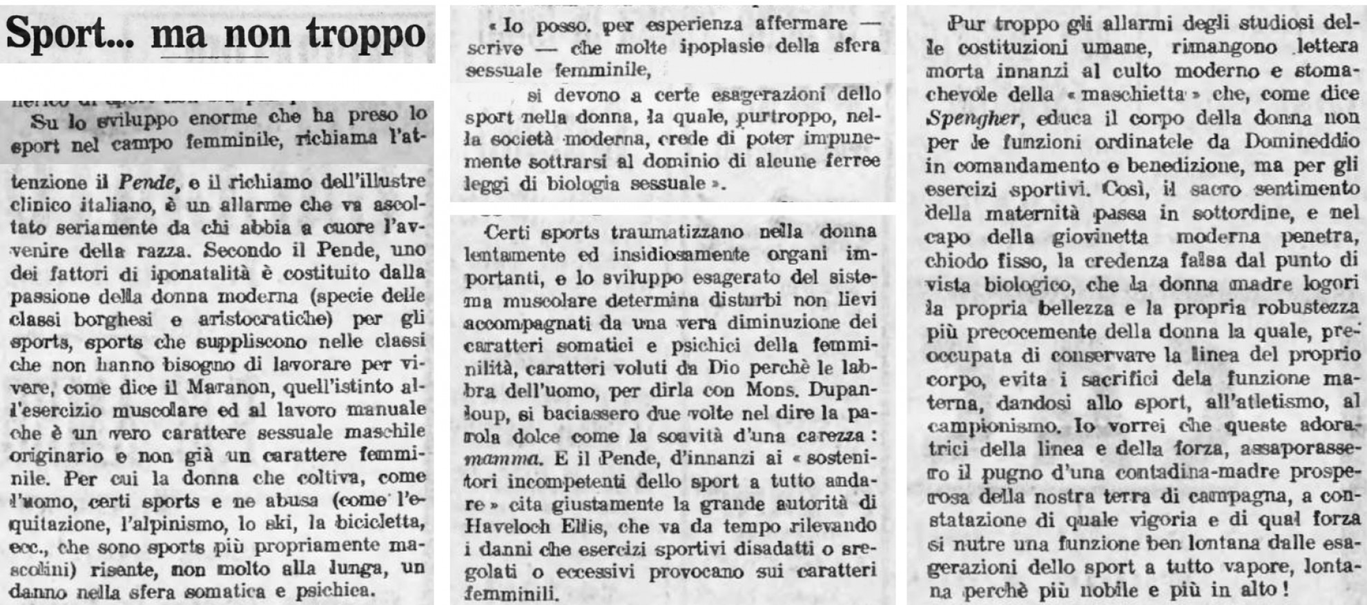 Rientra perfettamente nella categoria un articolo pubblicato nel 1930 su "Popolo e Libertà", che tratta il tema della diffusione delle pratiche sportive (anche) tra le donne. In quali termini e con quanta veemenza? Cediamo assolutamente la parola al firmatario, tale "Dottor A.": "Su lo sviluppo enorme che ha preso lo sport nel campo femminile, richiama l’attenzione il Pende, e il richiamo dell’illustre clinico italiano, è un allarme che va ascoltato seriamente da chi abbia a cuore l’avvenire della razza. Secondo il Pende, uno dei fattori di iponatalità è costituito dalla passione della donna moderna (specie delle classi borghesi e aristocratiche) per gli sports, sports che suppliscono nelle classi che non hanno bisogno di lavorare per vivere, come dice il Maranon, quell’istinto all’esercizio muscolare ed al lavoro manuale che è un vero carattere sessuale maschile originario e non già un carattere femminile. Per cui la donna che coltiva, come l’uomo, certi sports e ne abusa (come l’equitazione, l’alpinismo, lo ski, la bicicletta, ecc., che sono sports più propriamente mascolini) risente, non molto alla lunga, un danno nella sfera somatica e psichica. ‘Io posso, per esperienza affermare – scrive – che molte ipoplasi della sfera sessuale femminile (…) si devono a certe esagerazioni dello sport nella donna, la quale, purtroppo, nella società moderna, crede di poter impunemente sottrarsi al dominio di alcune ferree leggi di biologia sessuale’".