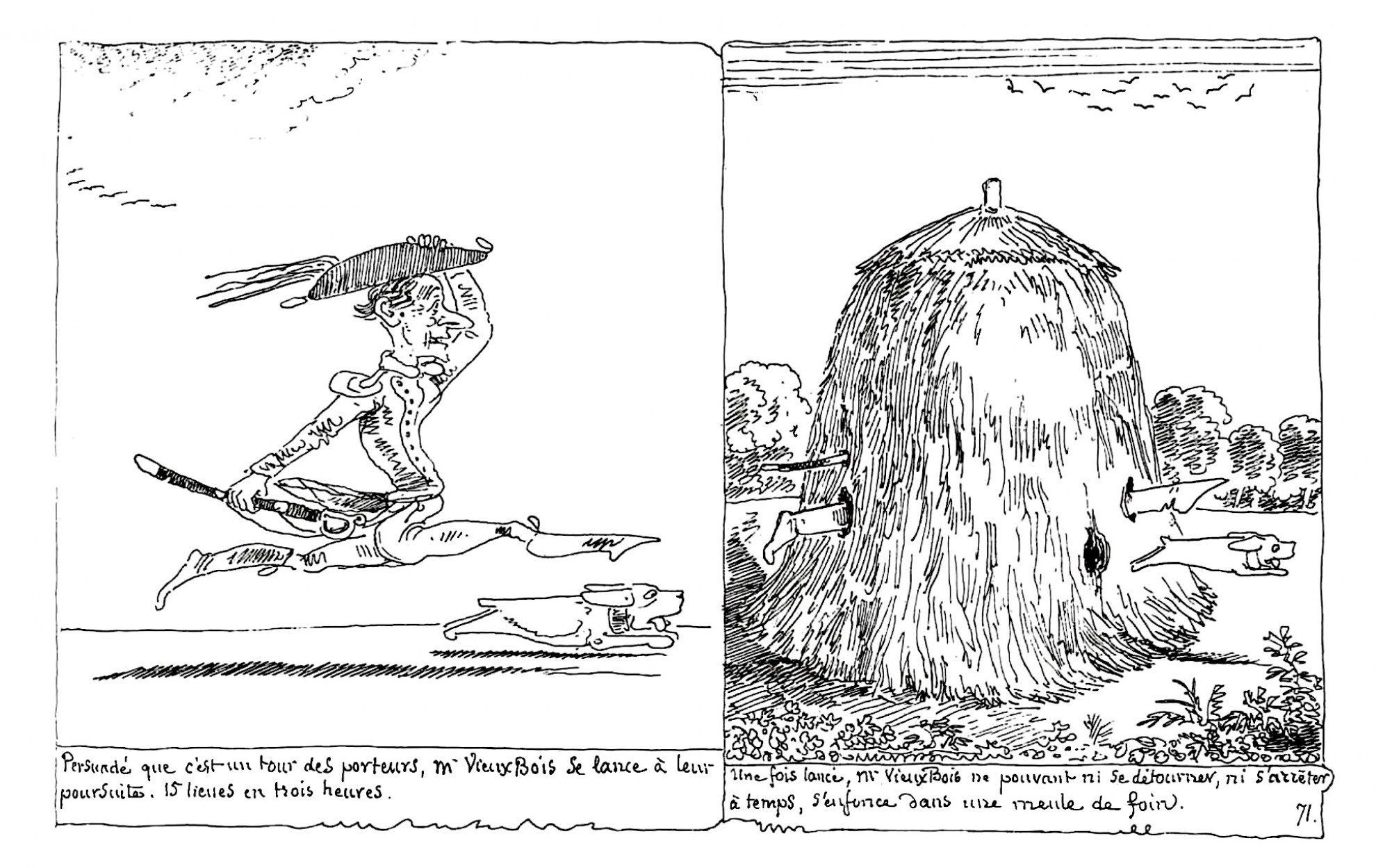 Siamo nel primo Ottocento. La grande macchina della rivoluzione industriale procede a tutto vapore: i mezzi di trasporto sono sempre più rapidi e nelle fabbriche nasce la produzione di massa. Nell’arte europea, per la prima volta da secoli si crea una frattura tra uno stile dominante, insegnato nelle accademie, e la ricerca di nuove forme espressive, ispirate alla cosiddetta "arte primitiva" (concetto in cui si accatastavano tante forme considerate minori come l’arte medievale, extraeuropea e i disegni dei bambini). Töpffer, spiega lo studioso Thierry Smolderen in Le origini del fumetto (NPE), reagisce a questo contesto: con una libertà tipica di un’epoca di rottura fonde una congerie di forme che combinano immagine e parola, disegno e narrazione (i cicli di incisioni di Hogarth, romanzi in cui irrompono elementi grafici come il Tristram Shandy di Sterne, vignette e caricature comiche…) e li filtra con un tratto che ha la spontaneità del disegno infantile. Ne nasce un nuovo linguaggio con cui raccontare storie che parodiano i ritmi frenetici dell’età industriale: in esse tipi umani come l’arrampicatore sociale o l’innamorato stucchevole corrono freneticamente all’inseguimento del proprio oggetto del desiderio, in un moto incessante e ridicolo che trova perfetta espressione nella forma degli album, lunga e stretta come un treno e scandita da finestrini-vignetta accompagnati da sibilline didascalie. E anche il tratto di Efferente corre, libero da briglie: anarchico e sgangherato, spontaneo e irriverente (caratteristiche che si innervano in personaggi, scenari, contorni delle vignette e grafia delle didascalie), rappresenta nella sua irriducibile singolarità una protesta contro le tecniche standardizzanti imposte ai disegnatori che lavoravano per i giornali "di massa", con le loro figure "fredde e impersonali" (dice Efferente) create con i "terrificanti processi della carta da ricalco".